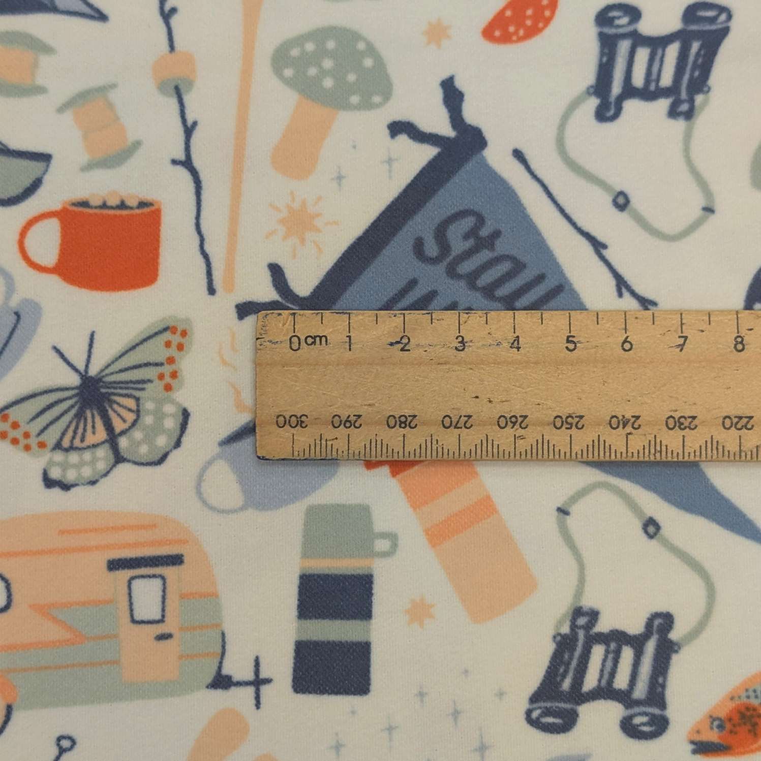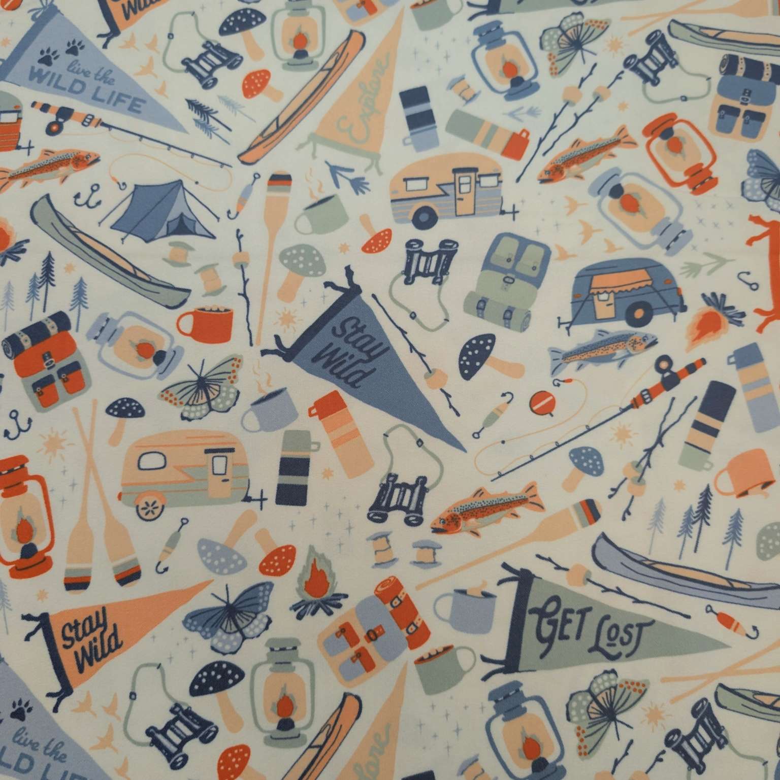 Lovely soft brushed cotton Art Gallery flannelette. Warm white background with camping images in tones of orange and blue