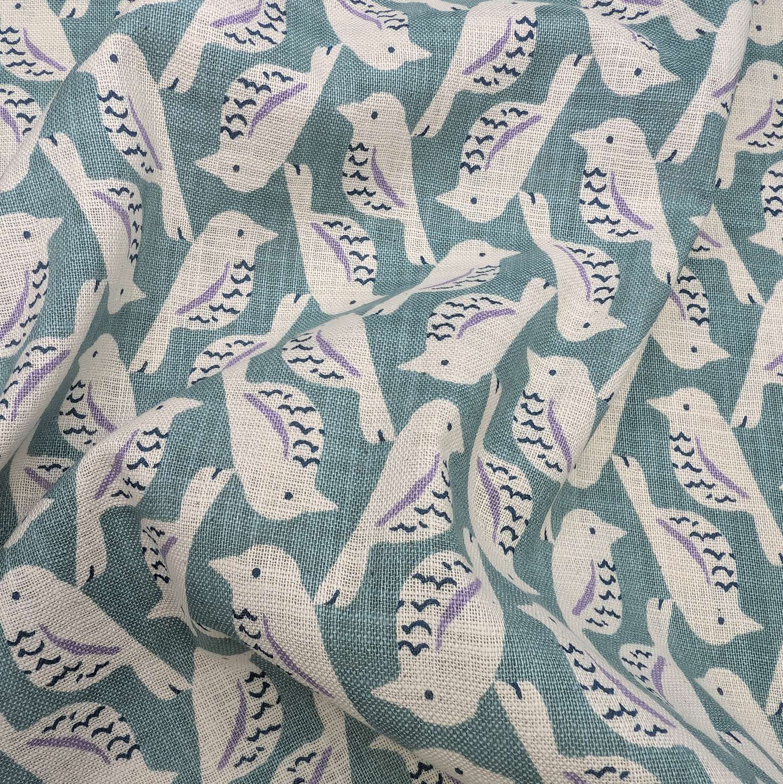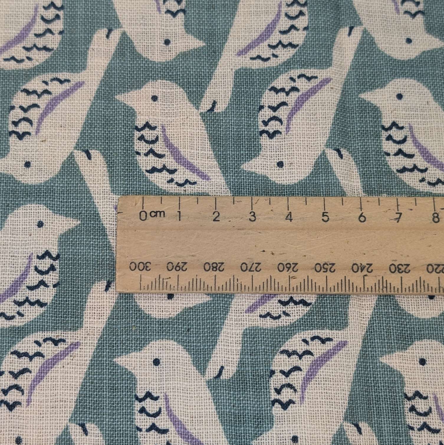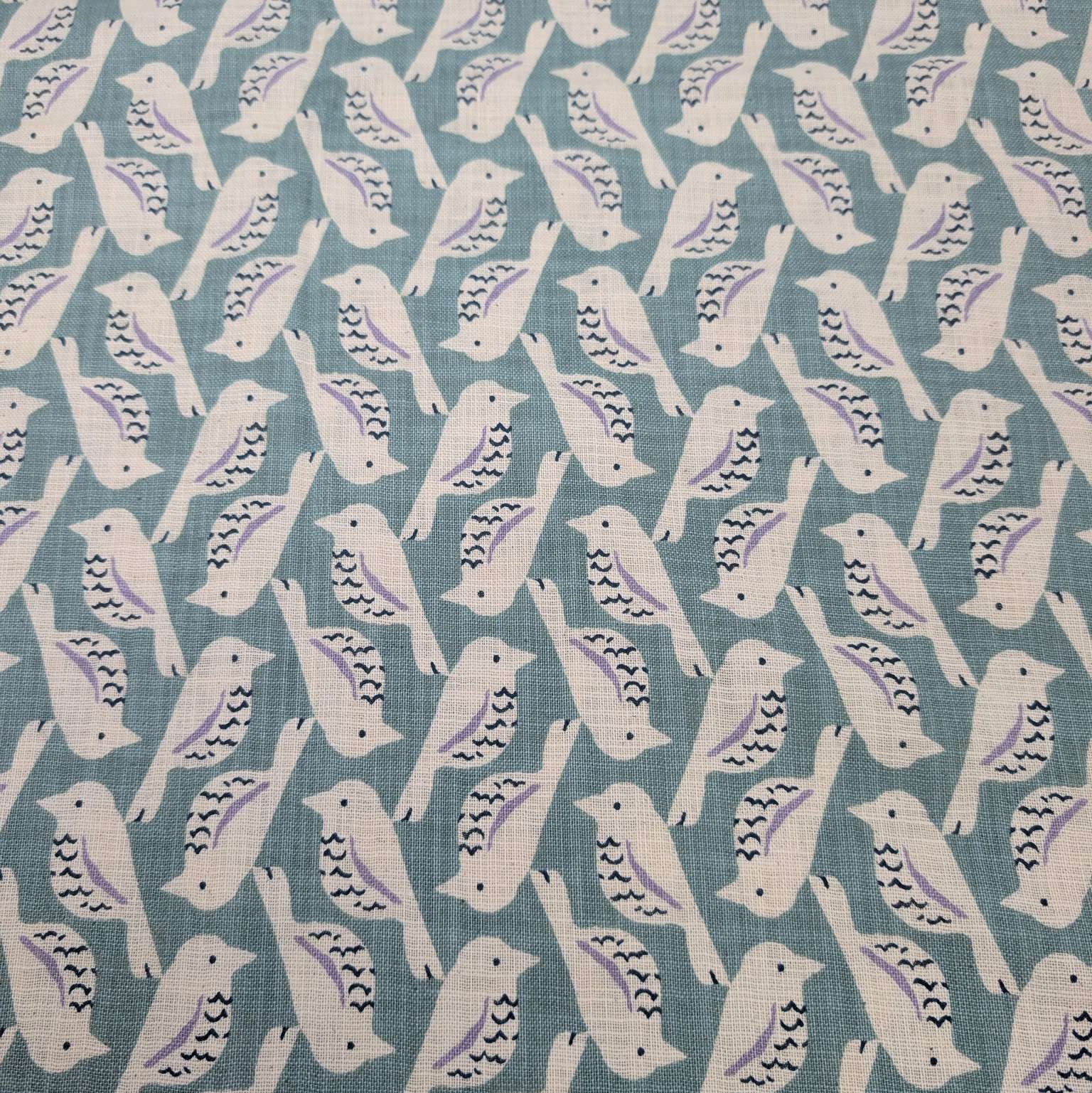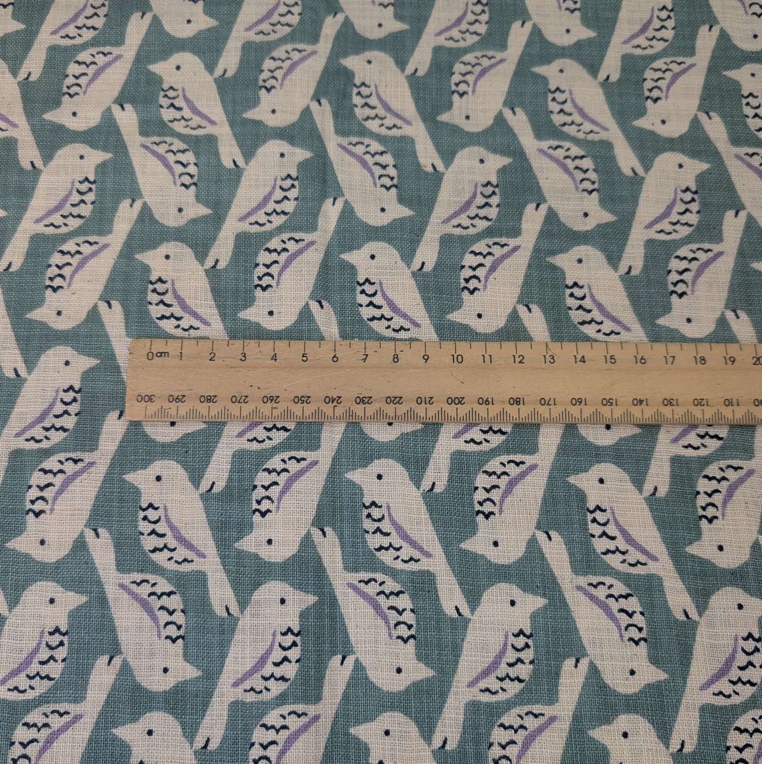 Medium to heavy weight printed Japanese cotton in teal green all over bird print in cream with dark green and lilac accents.