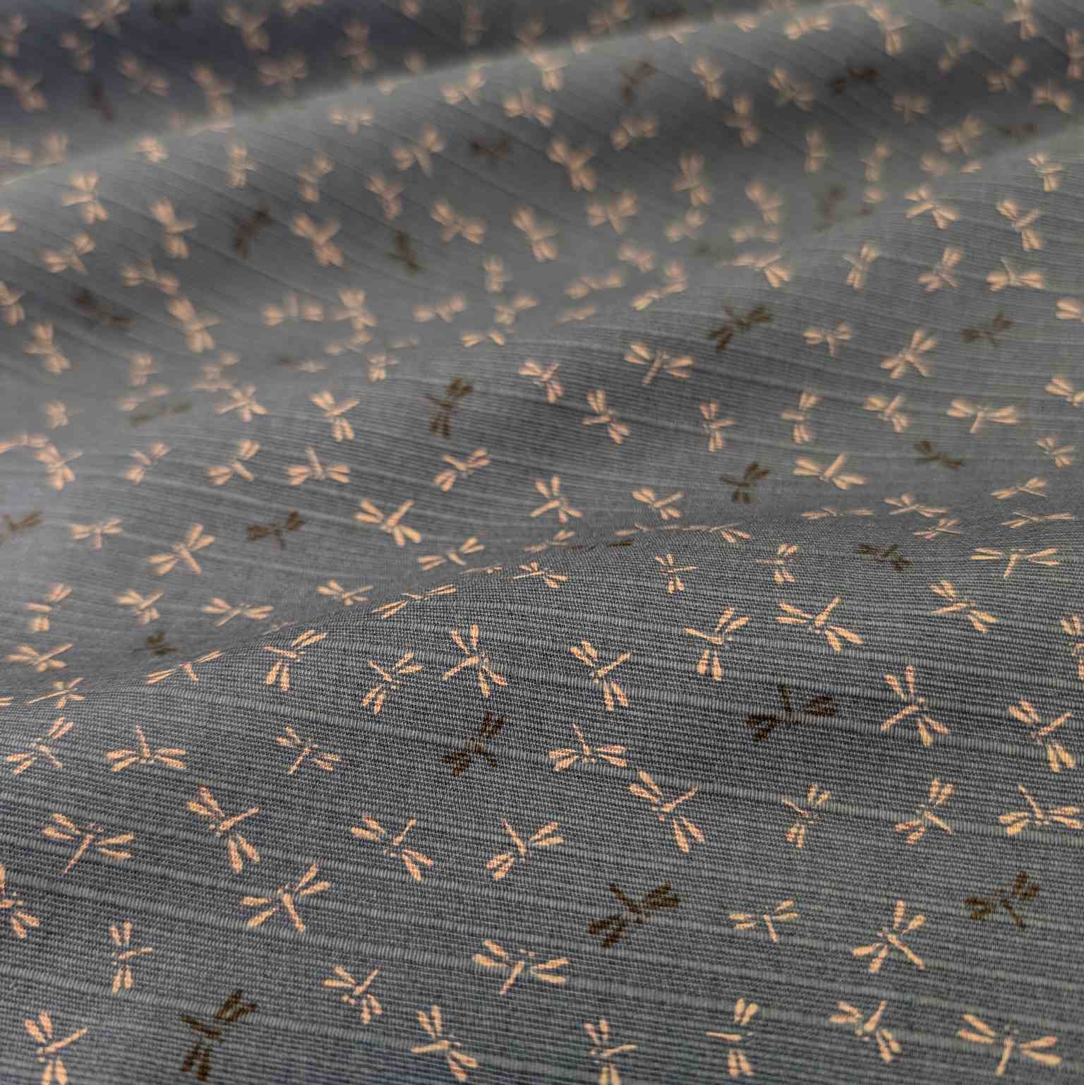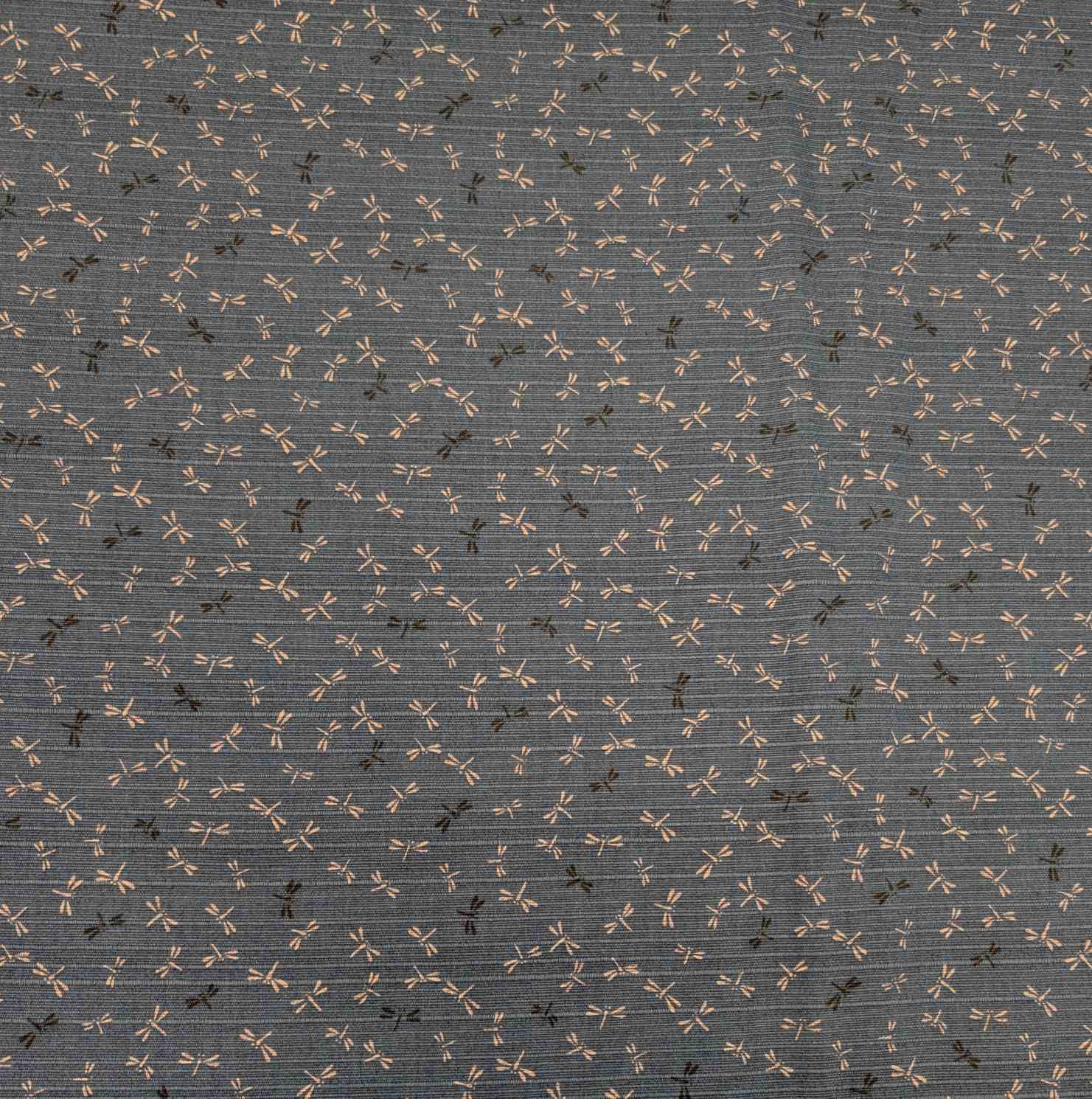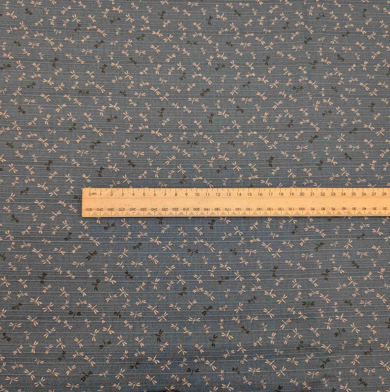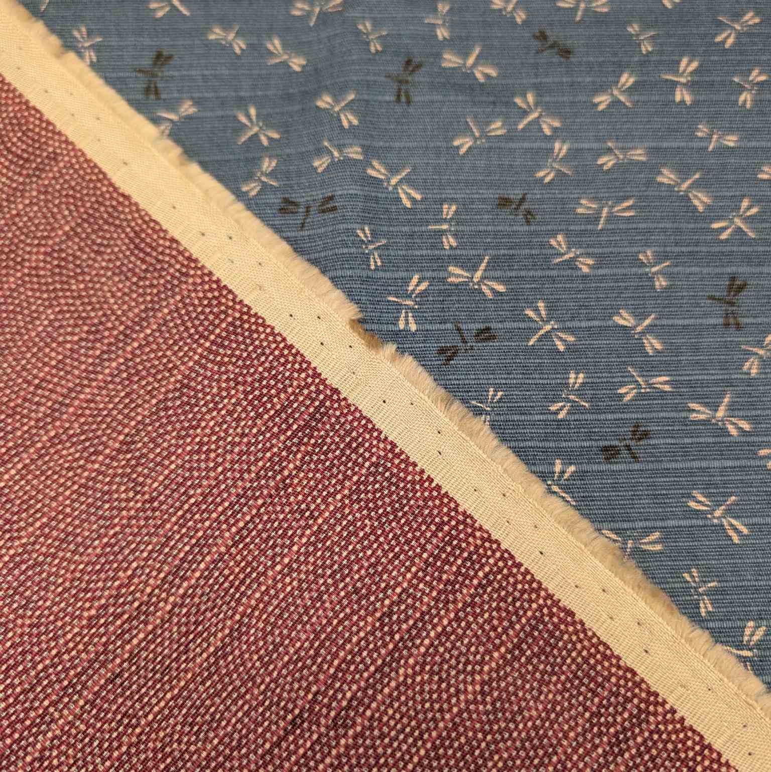 Medium weight printed double sided Japanese Shantung cotton. Washed teal base with small dragonfly print. Reverse has traditional wave print and cloth has traditional slubby Shantung texture and sheen