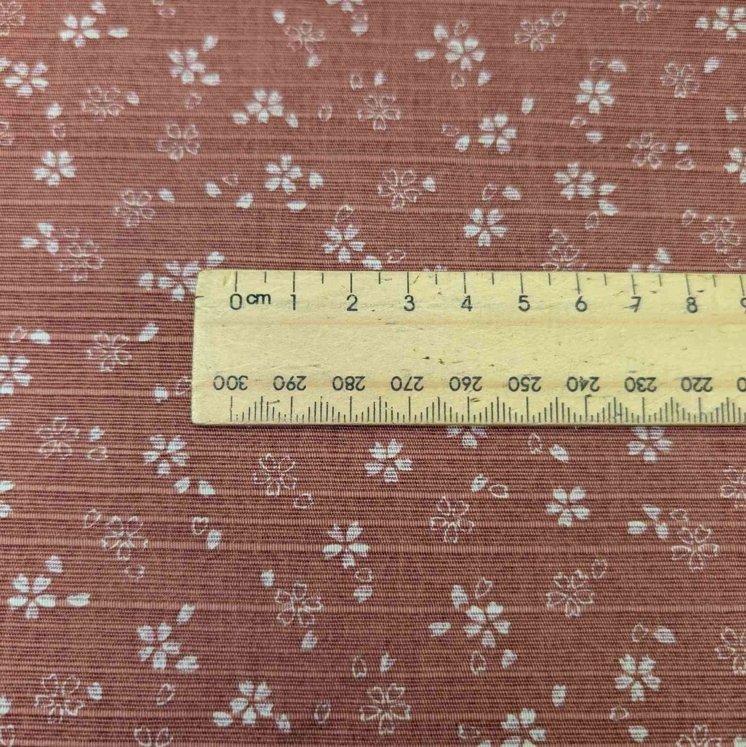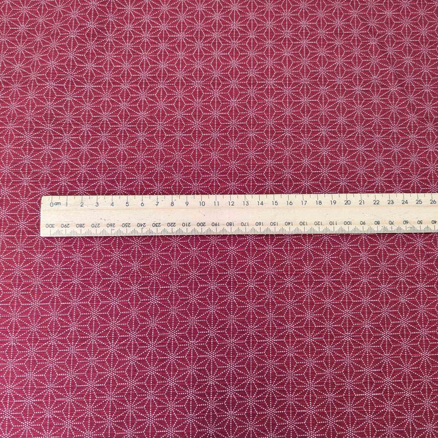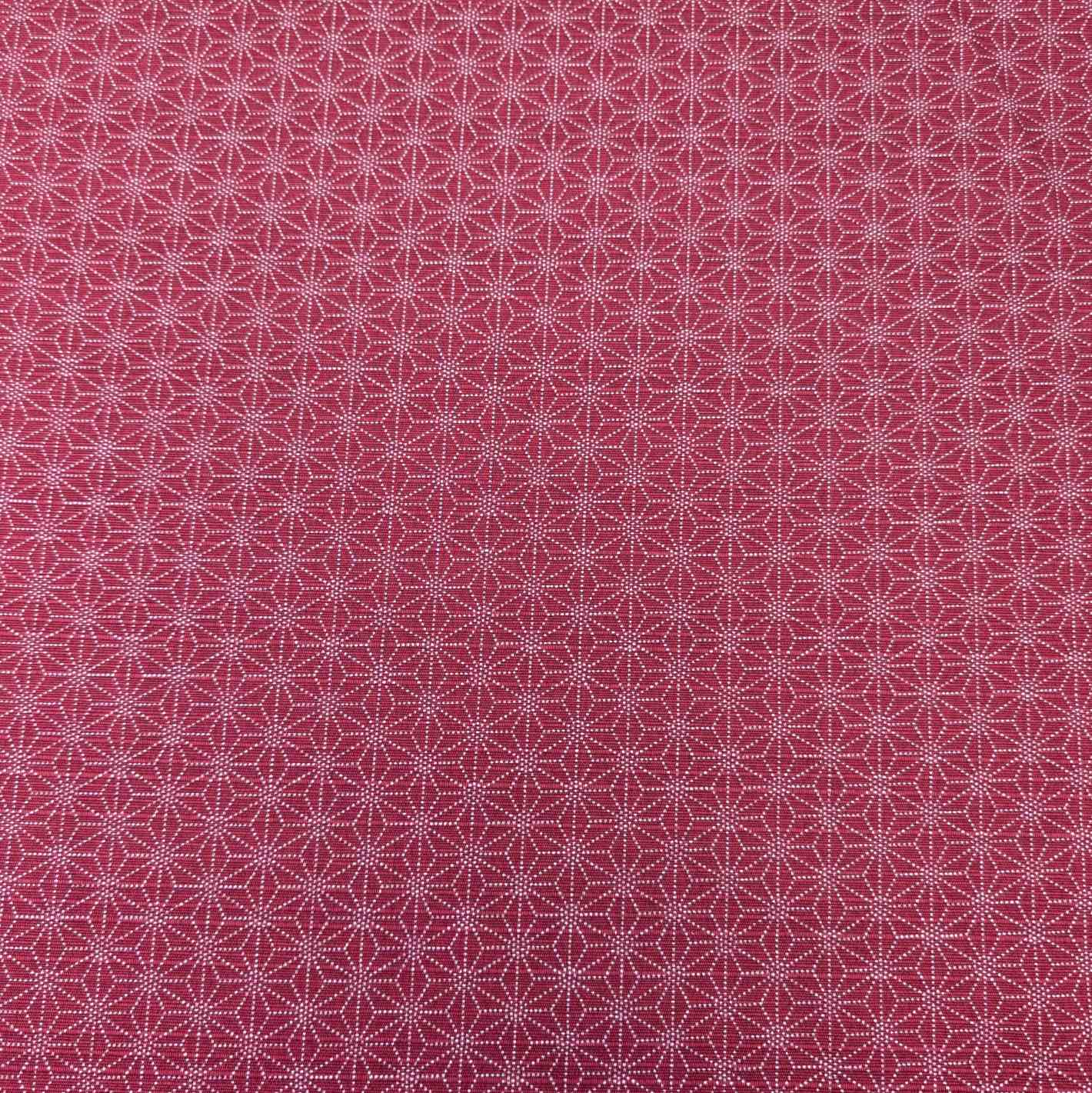 Medium weight printed double sided Japanese Shantung cotton. Washed Burgundy base with small scattered floral print. Reverse has traditional star print and cloth has traditional slubby Shantung texture and sheen