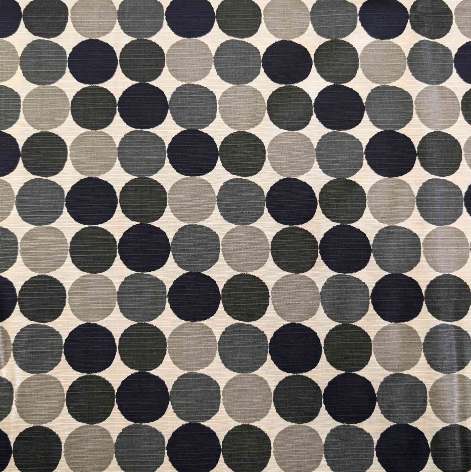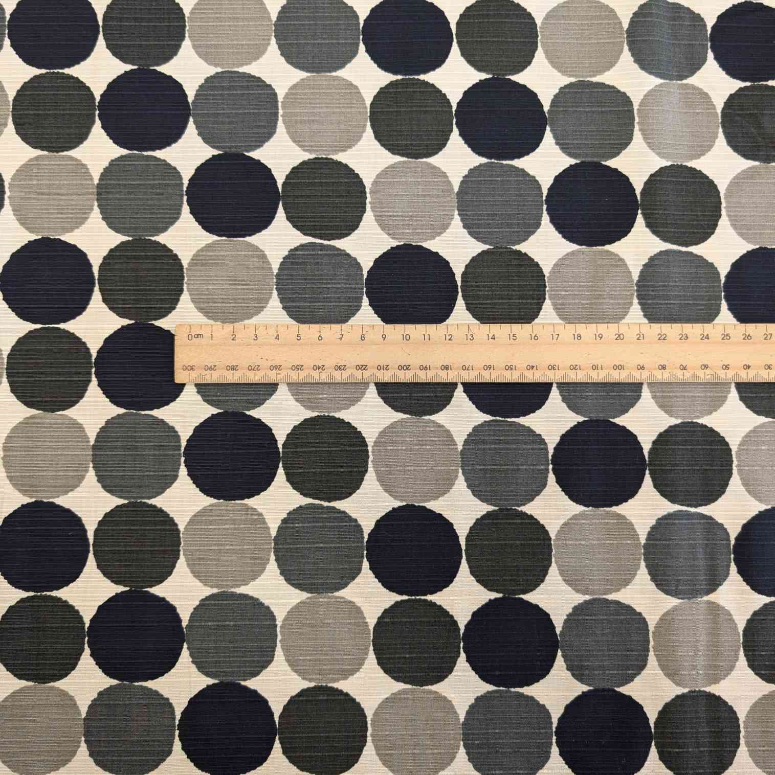 Medium weight printed Japanese Shantung cotton. Cream base with circles in shades of grey and traditional slubby Shantung texture and sheen