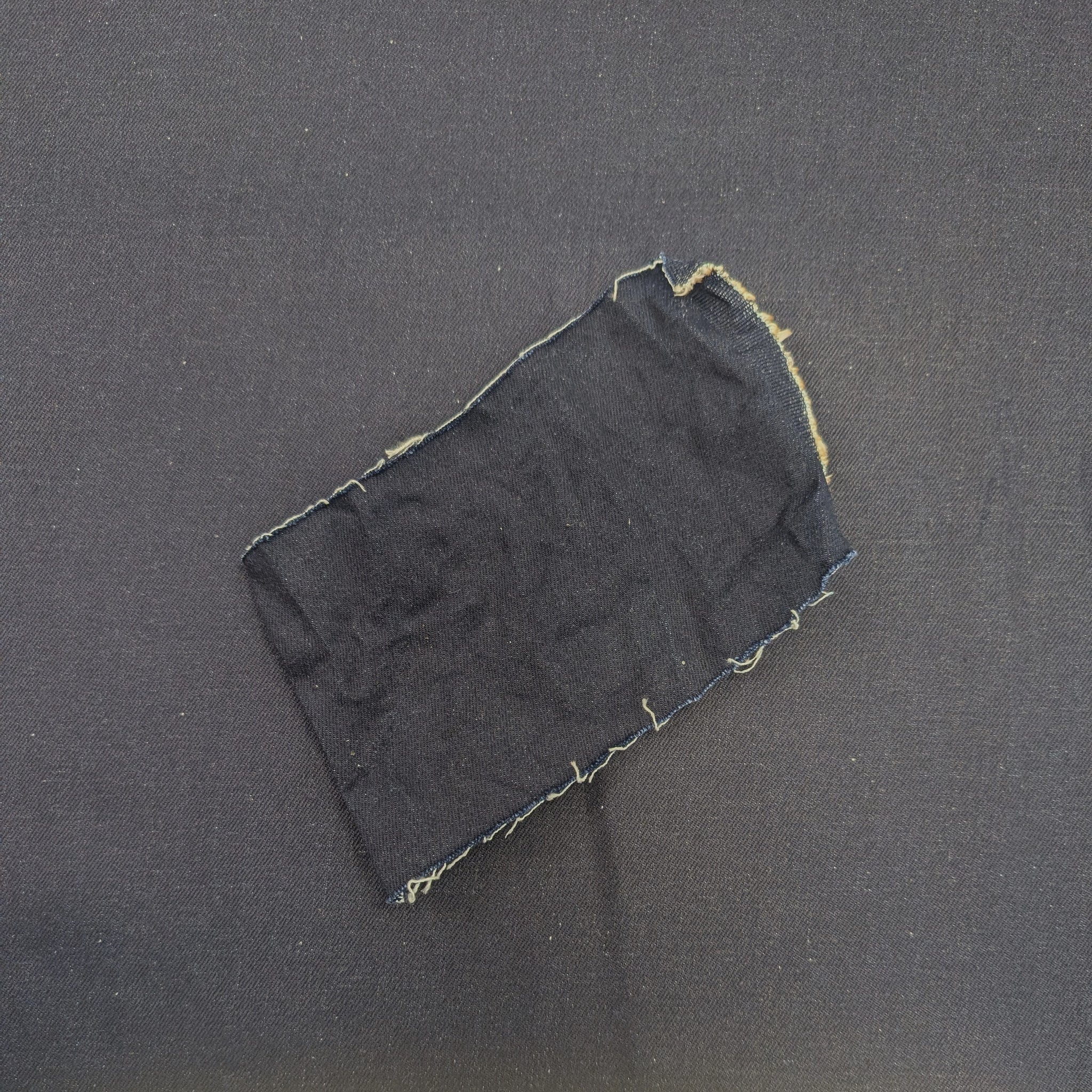 98% Cotton with 2% Spandex, medium weight denim. Deep Indigo wash denim with approximately 30% horizontal stretch.  Last image shows washed swatch.
