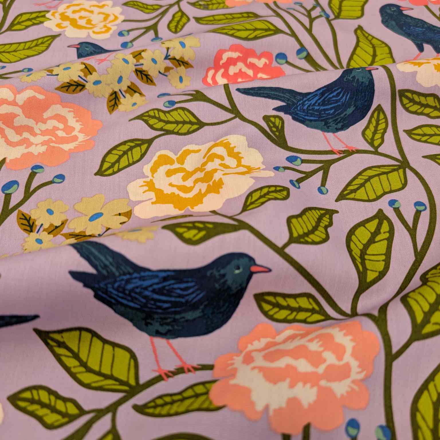 Art Gallery premium mid weight cotton with beautiful drape . Lilac background with medium scale floral design in in vibrant green and neon pinks and orange with scattered blackbirds.