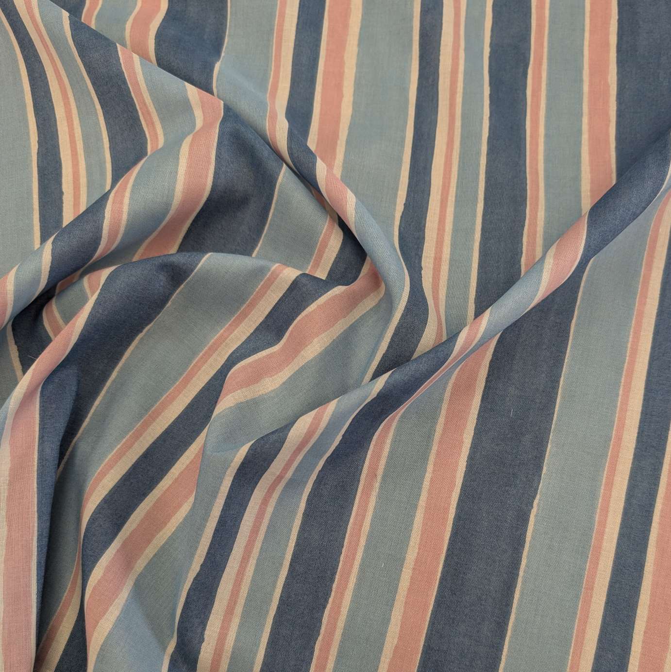 Lightweight Japanese cotton Batiste with painterly vertical stripes. Blues, pink and warm white colours.