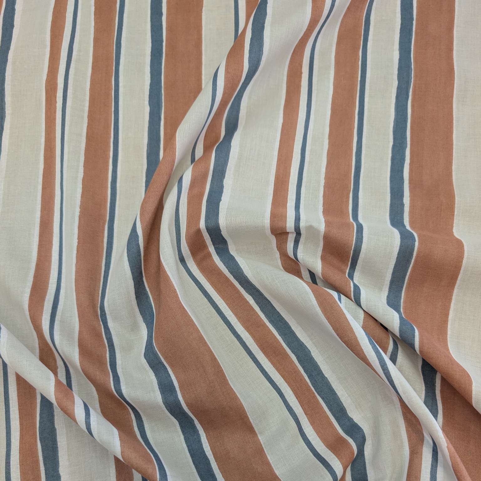 Lightweight Japanese cotton Batiste with painterly vertical stripes. Taupe, charcoal, cream and Sienna colours.