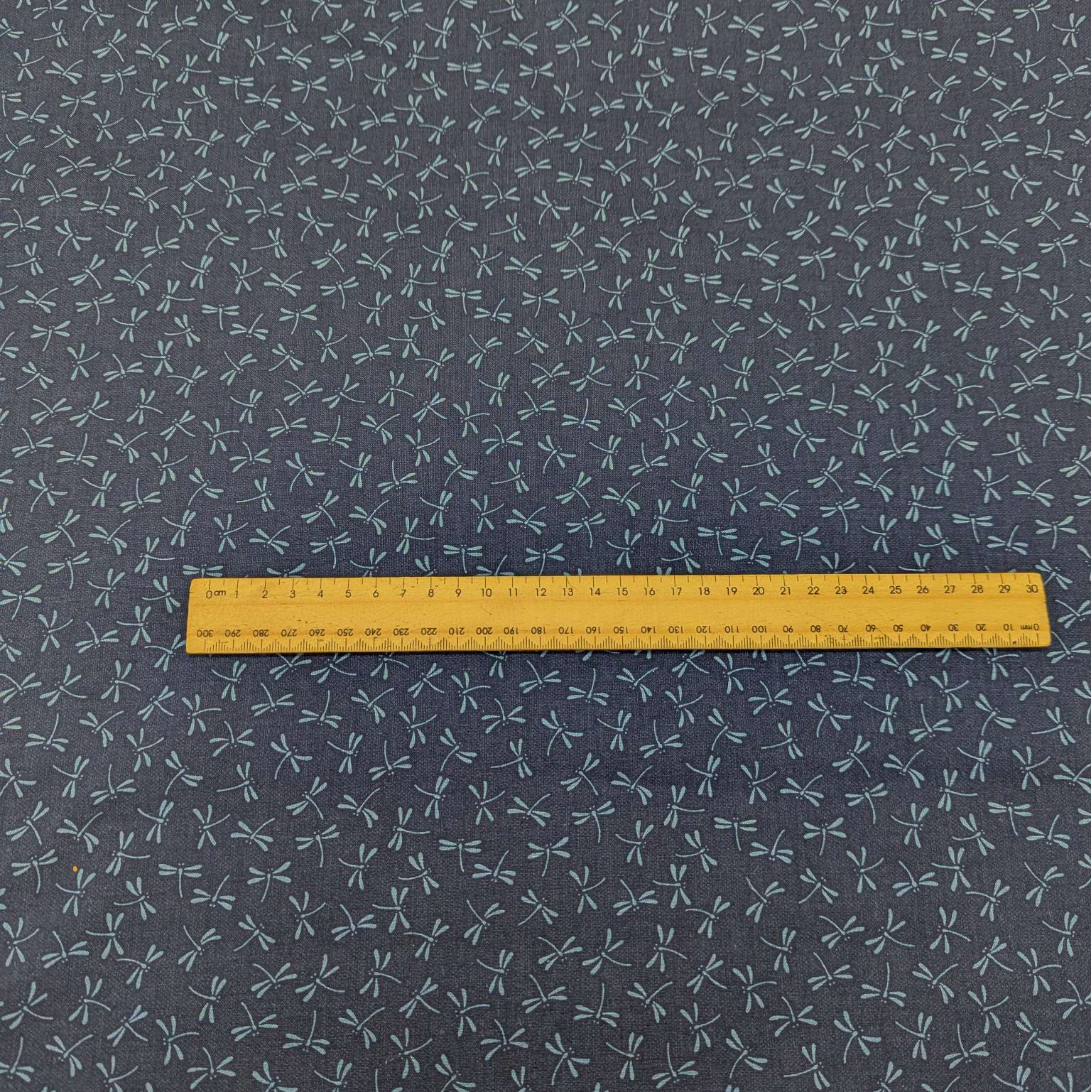 Japanese 100% Cotton, Tonbo, indigo base with a small dragonfly design, available now at Minerva's Bower and a ruler included for scale
