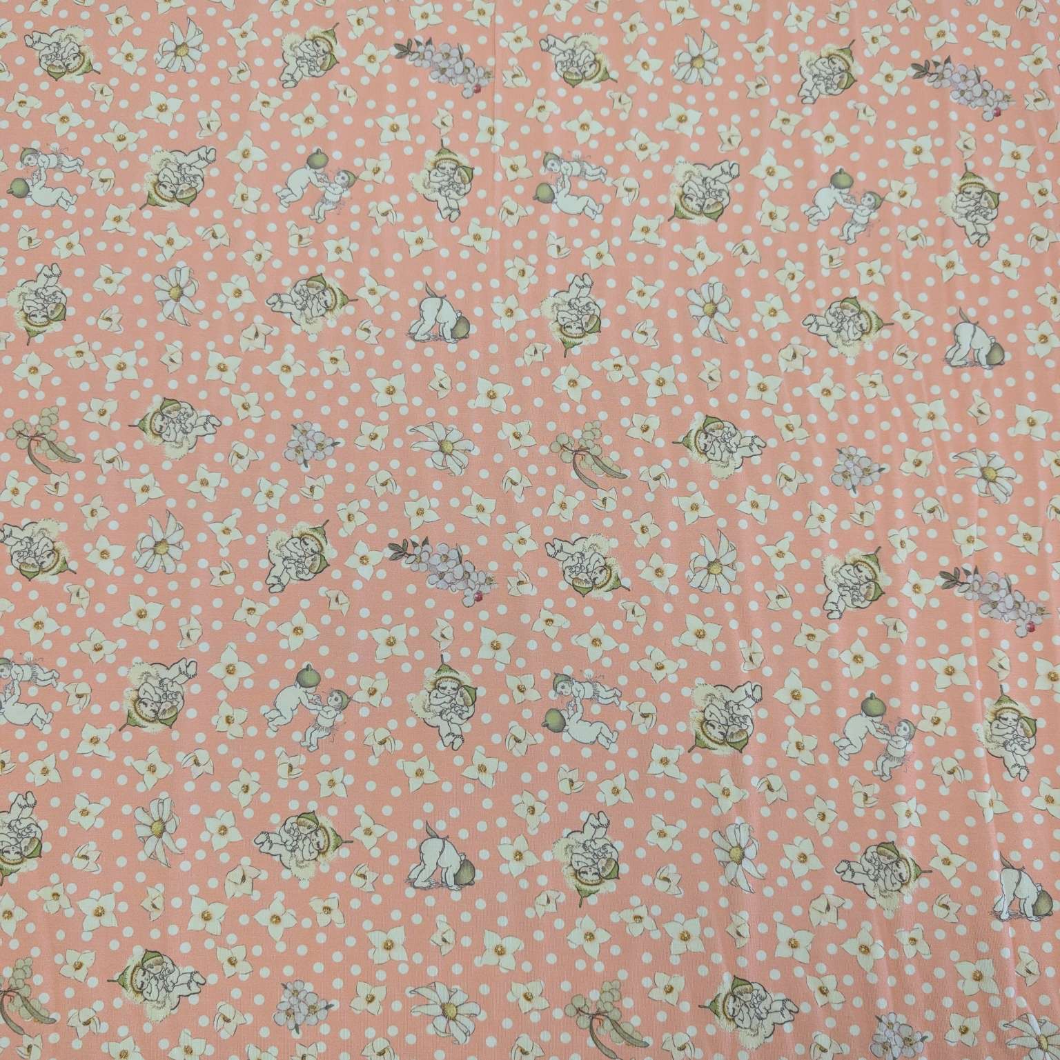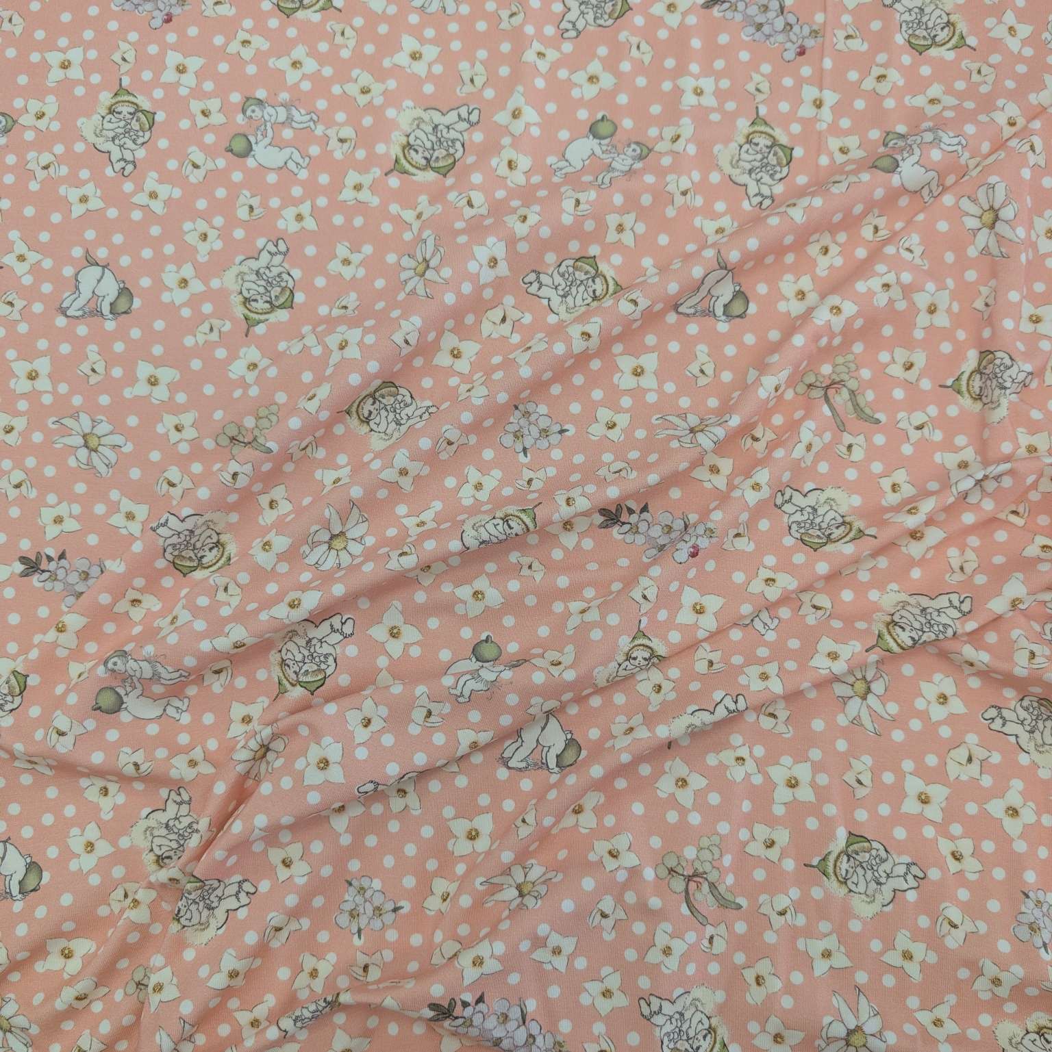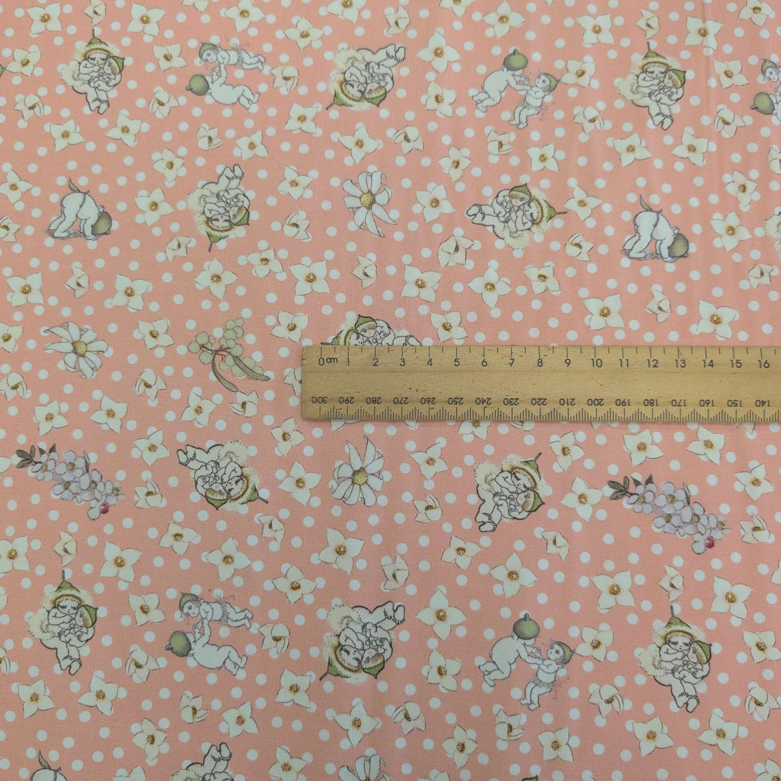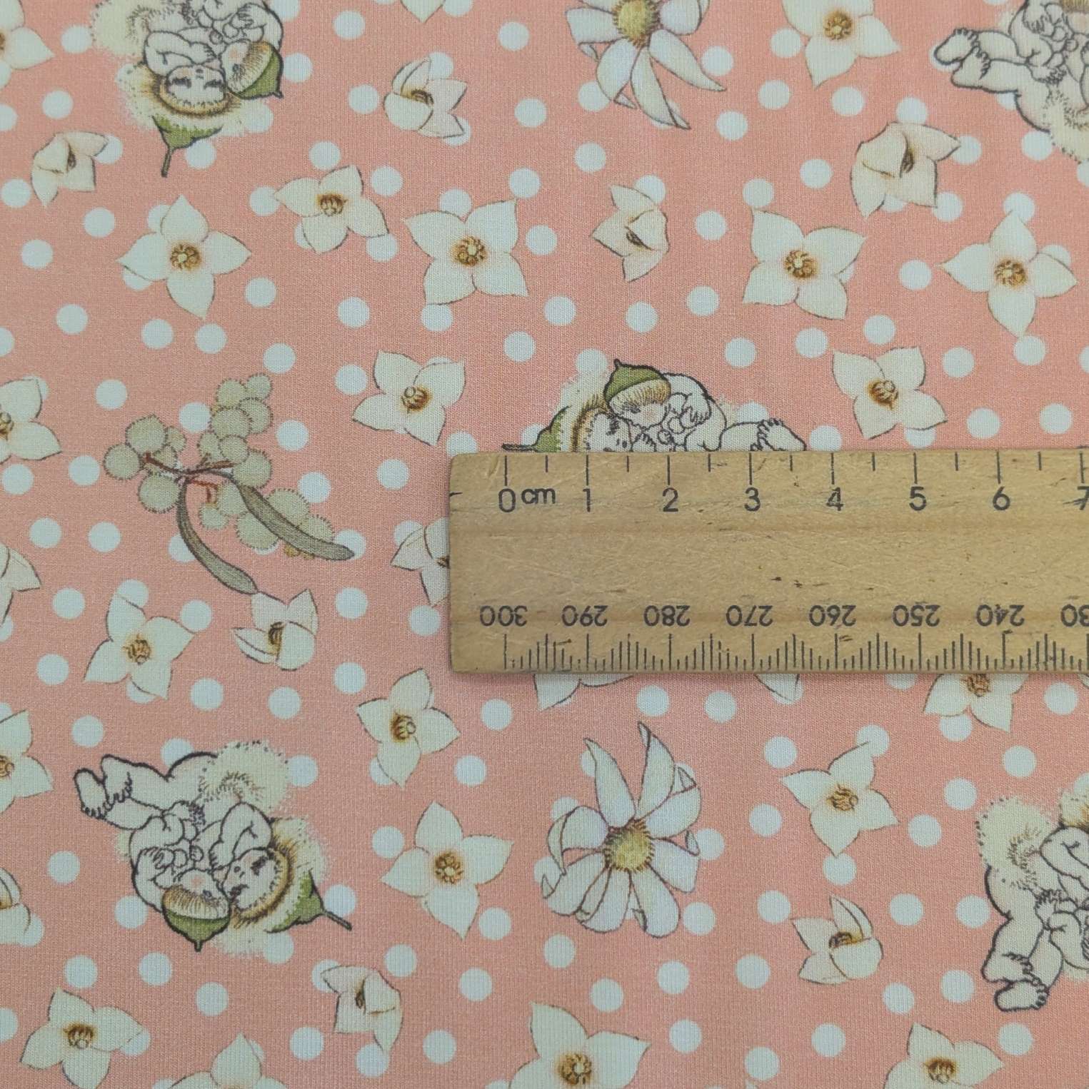 Bamboo spandex (5%) jersey with pink background and smaller scale May Gibbs Gum Nut baby design and small white dots. Soft silky drape and hand