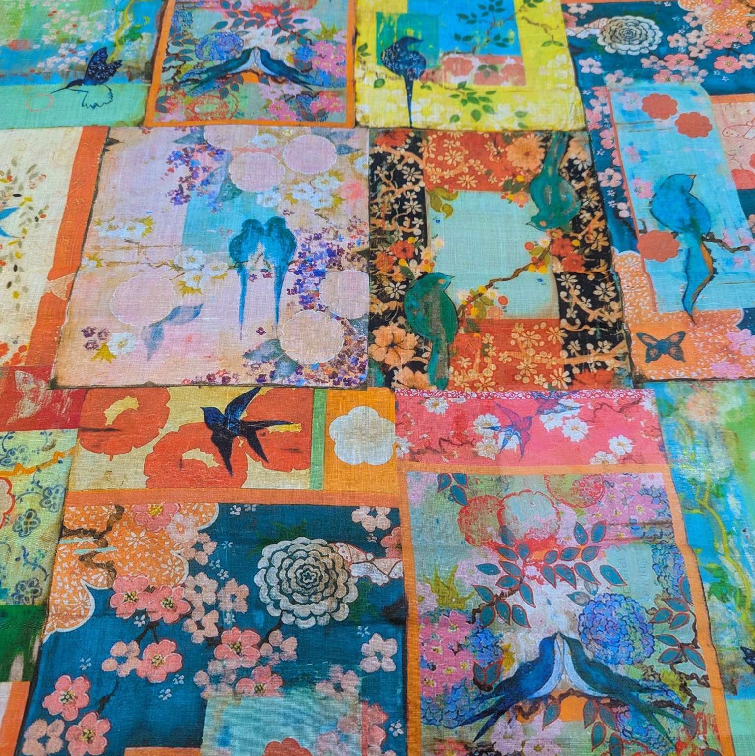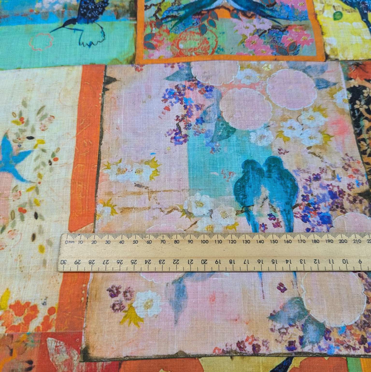 Beautifully soft and drapey 100% Ramie with bright panels of traditional Chinese motifs of birds, butterflies and blossoms in pinks, yellows, blues, greens.
