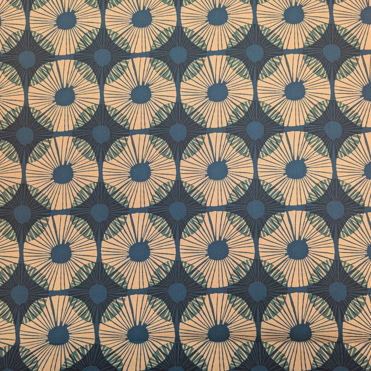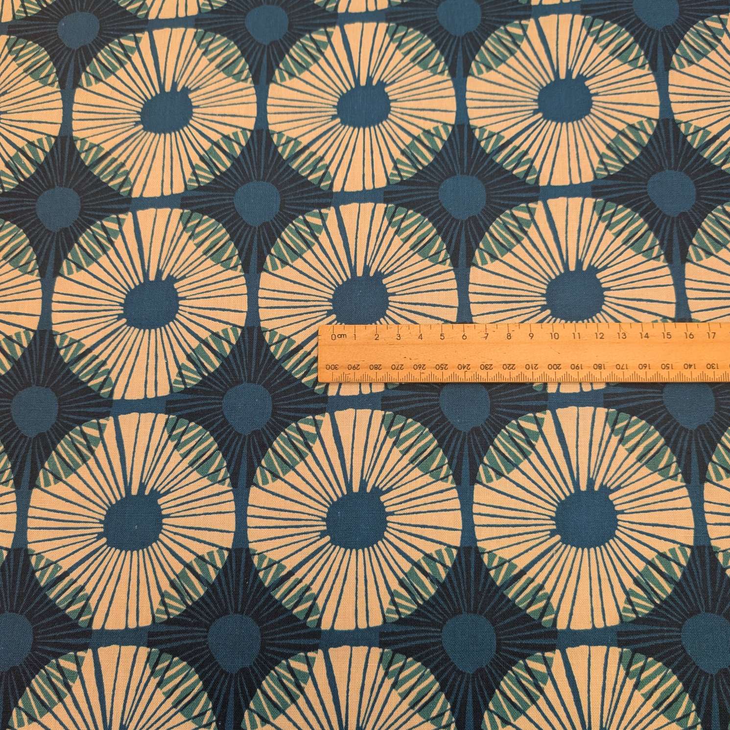 Designed by Jen Hewett for Ruby Star Society. Lovely medium weight 30% linen 70% cotton with woodblock style circular design in natural linen colour overlayed with shades of blue.