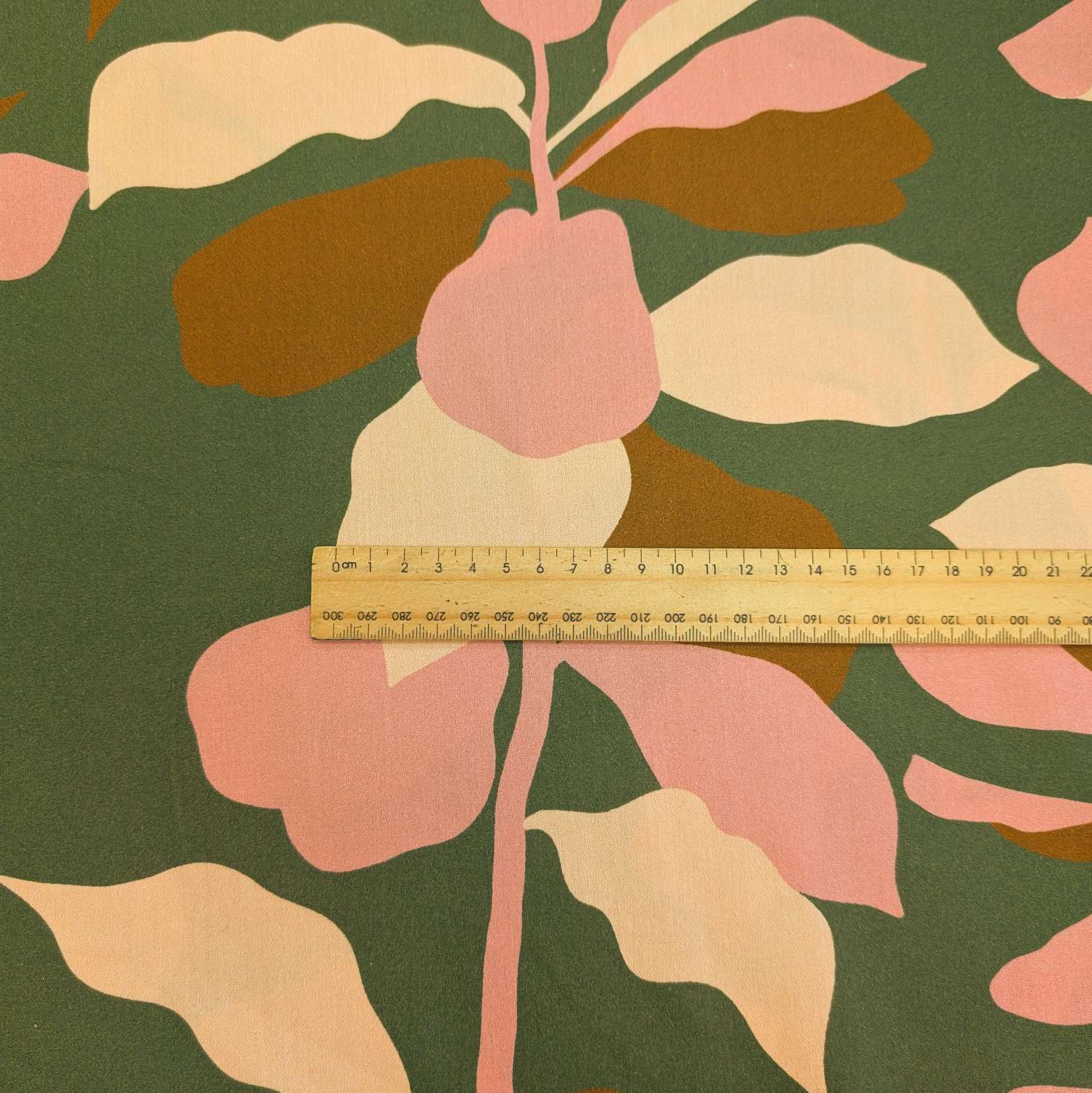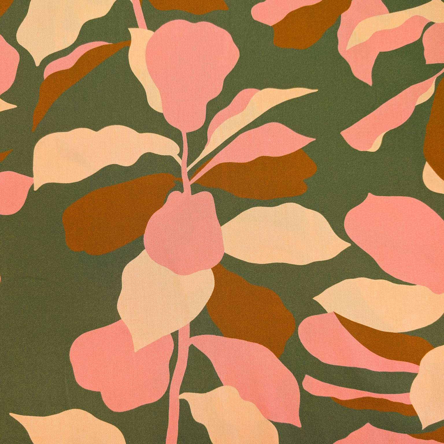 Lovely medium weight soft cotton with large foliage design in brown, pink and peach on a deep moss green base.