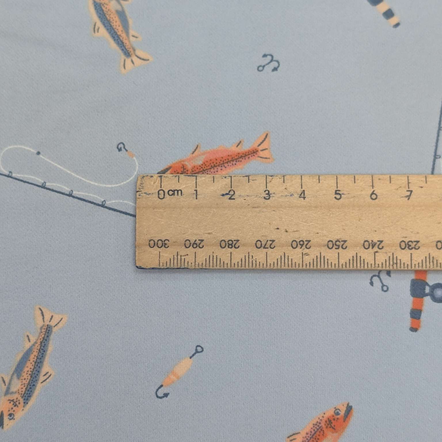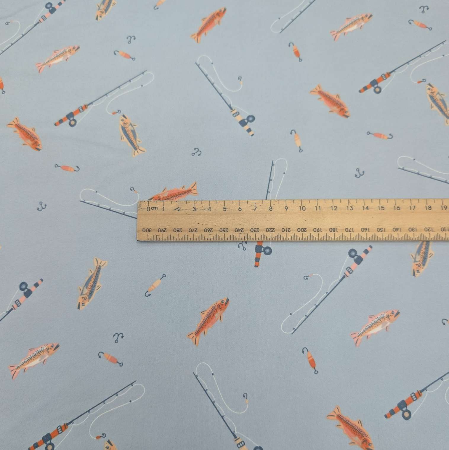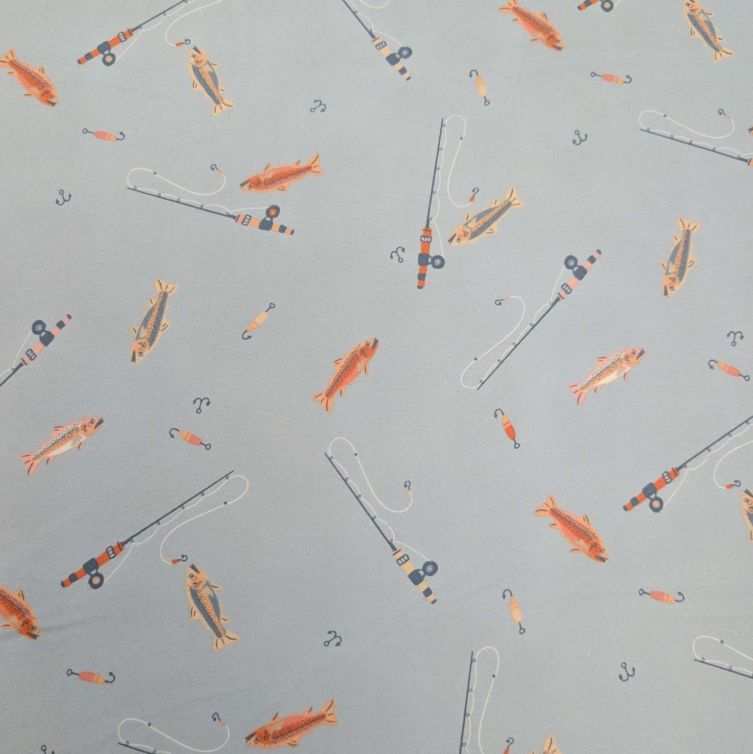 Lovely soft brushed cotton Art Gallery flannelette. Soft grey blue background with fishing images in tones of orange and blue