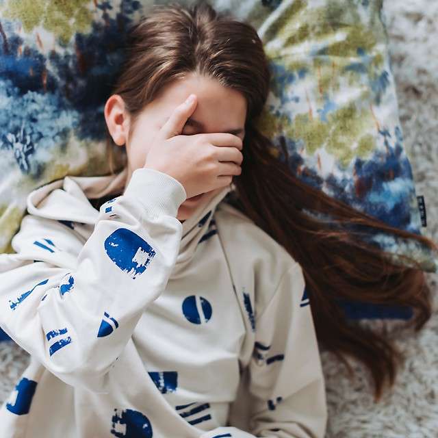 Medium weight soft French Terry from See You At Six. 96% cotton 4% elastane. Cream base with scattered abstract design in blue.