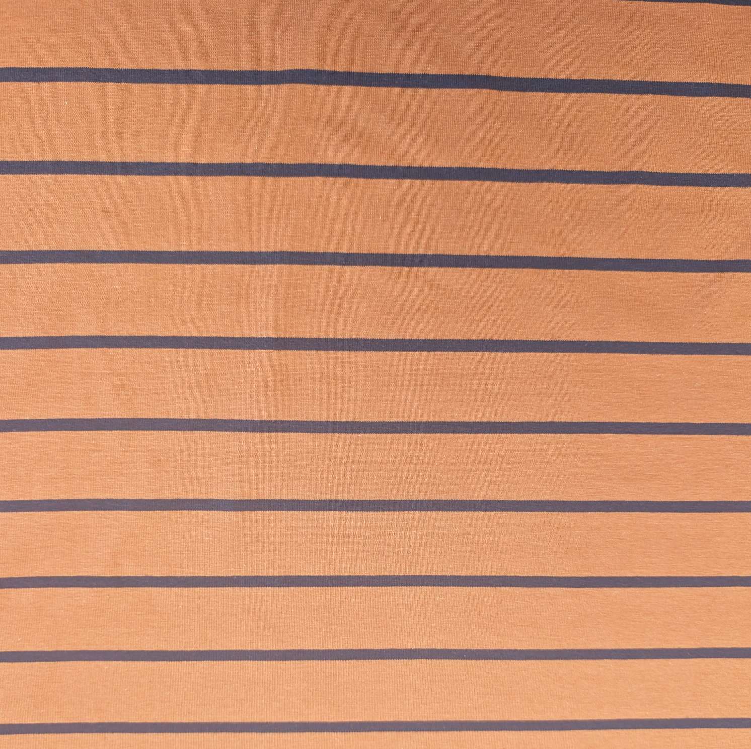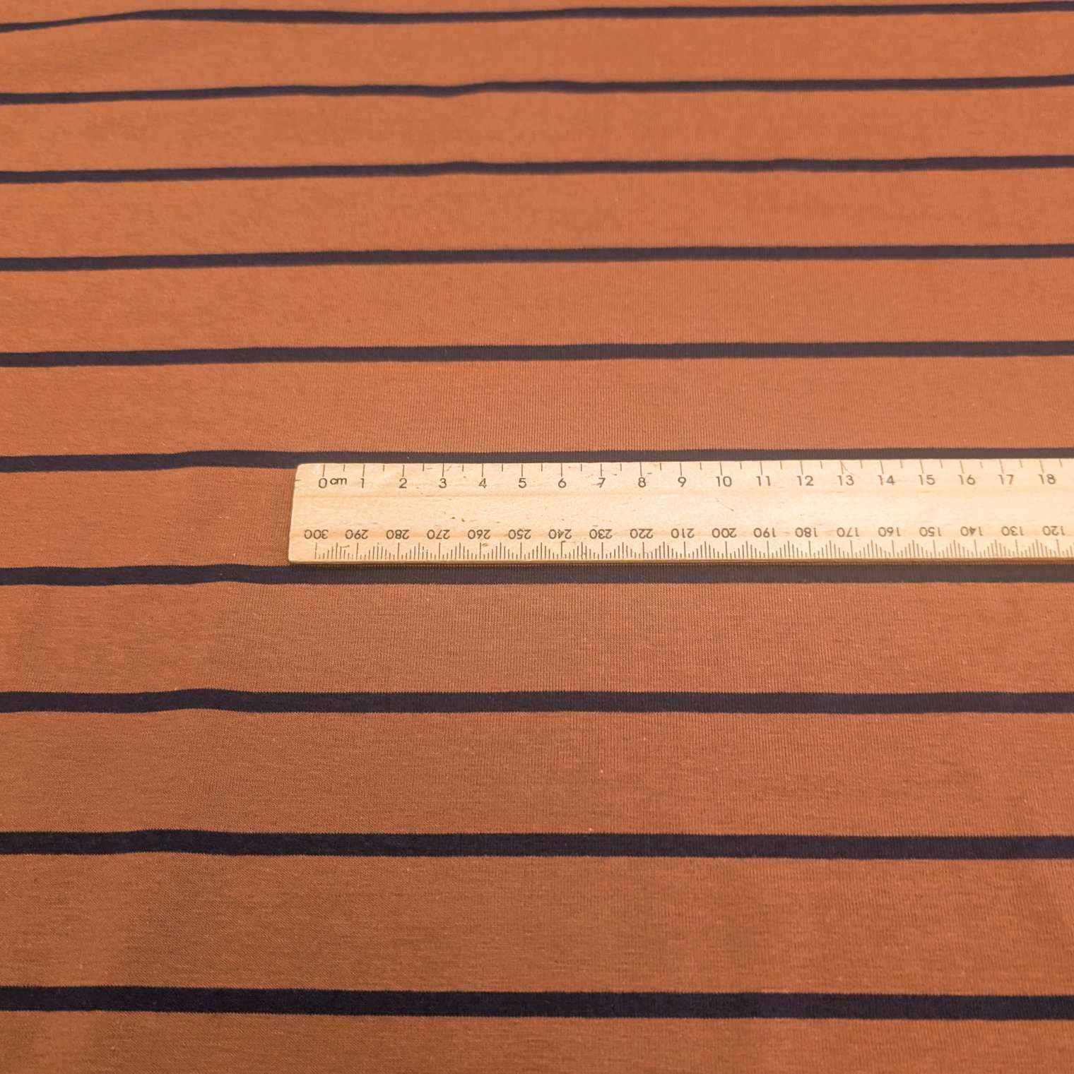 95% cotton, 5% spandex in dusky blue with white stripe. Deep bronze base with 4mm dark navy horizontal stripe. Lovely cotton spandex jersey with excellent return.