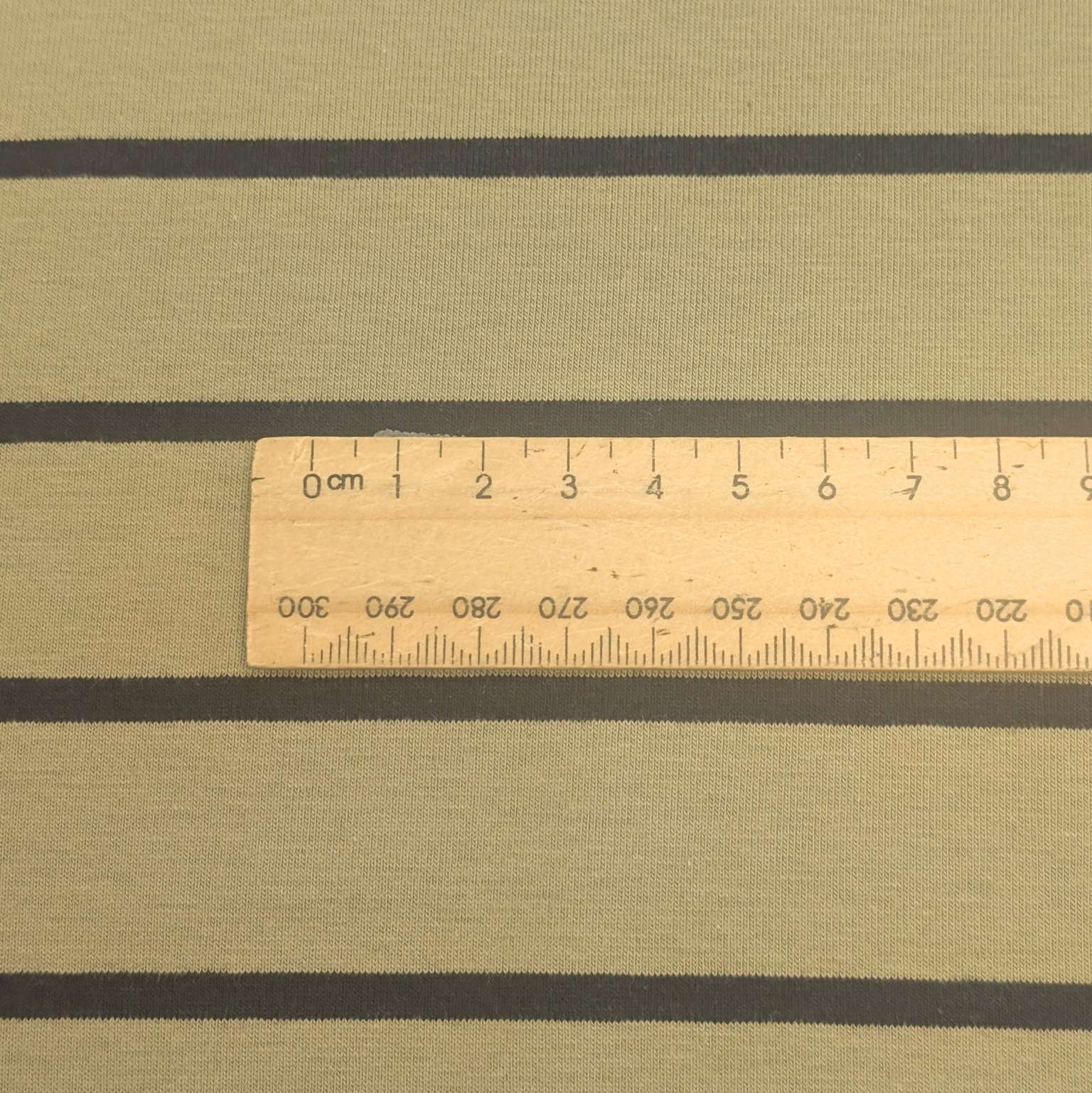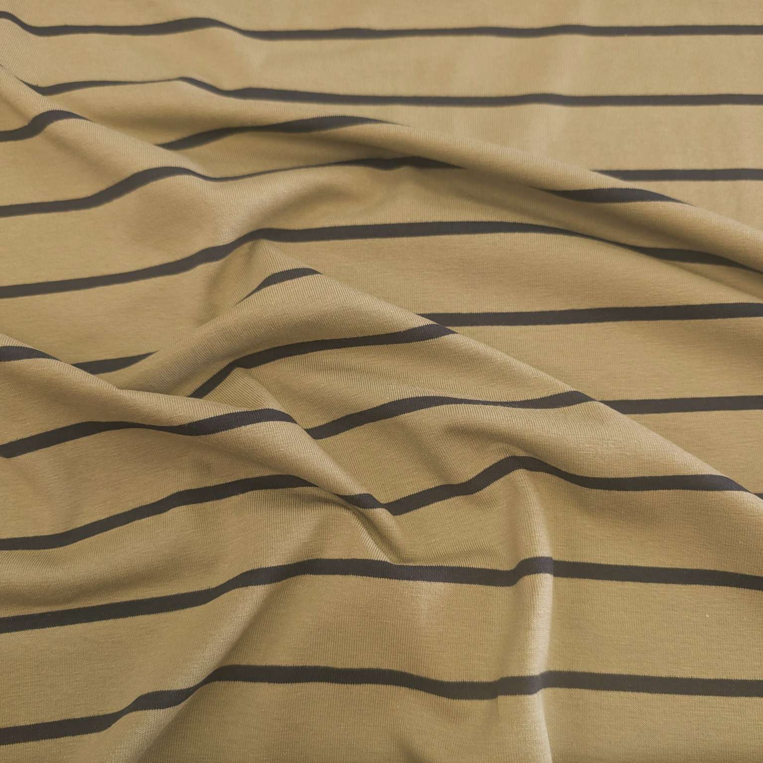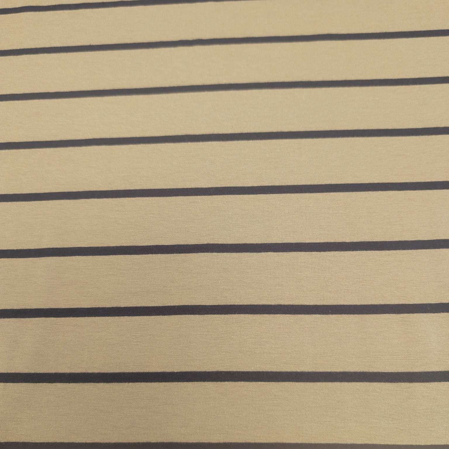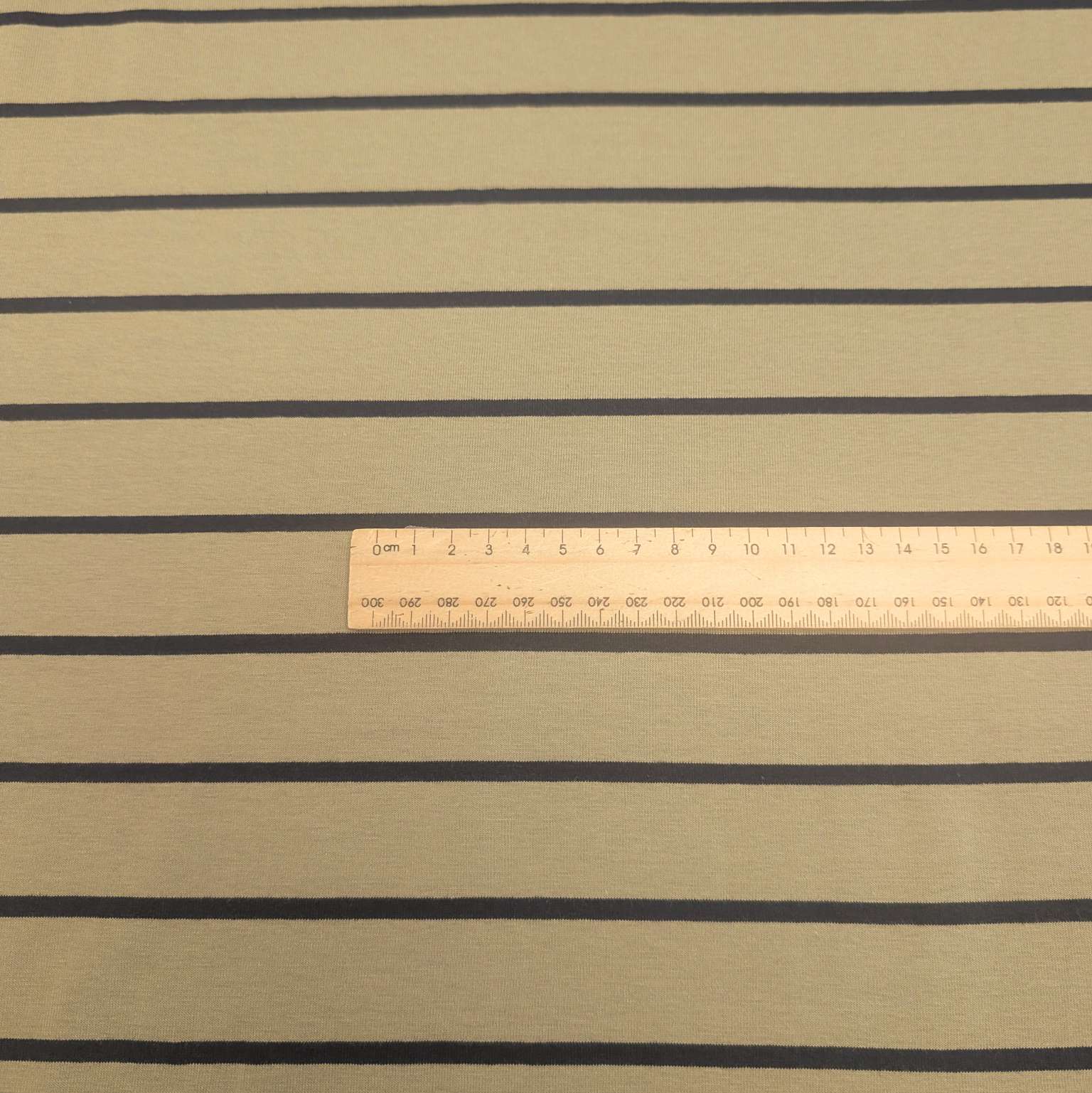 95% cotton, 5% spandex in dusky blue with white stripe. Khaki base with 4mm dark navy horizontal stripe. Lovely cotton spandex jersey with excellent return.