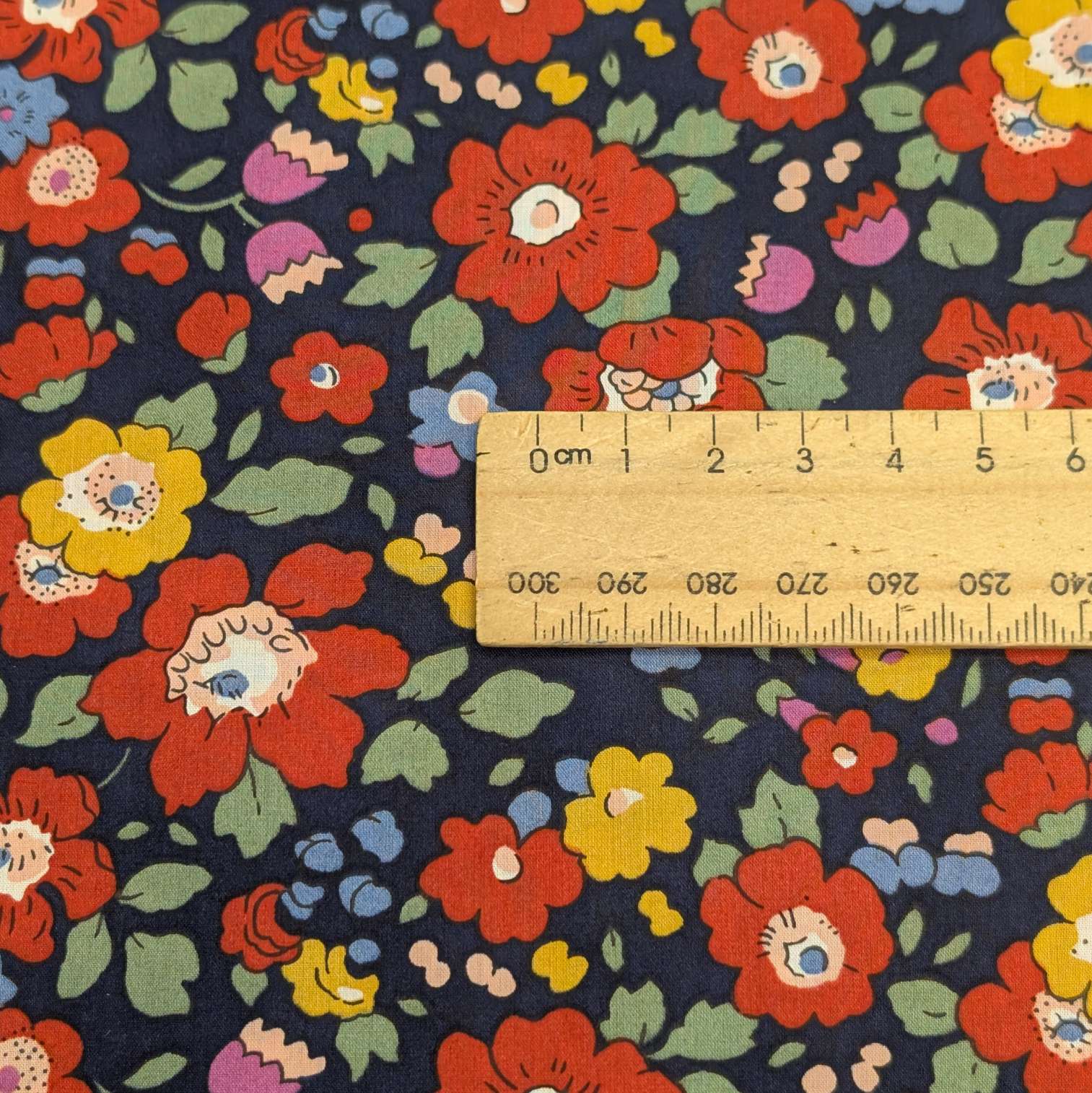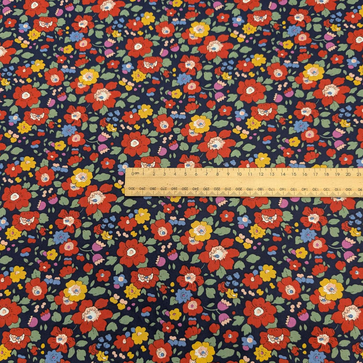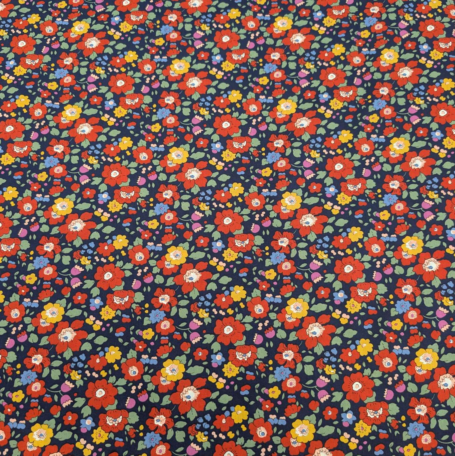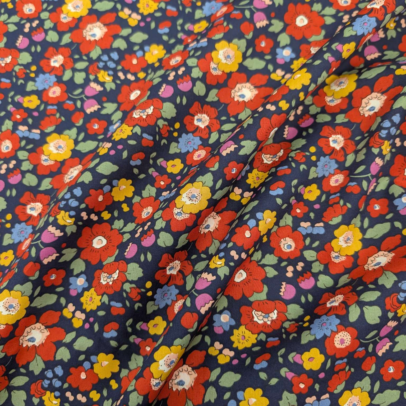 Betsy Meadow is a stylised small floral design, created in 1933. It was designed by the mysterious designer D.S., who was behind many of our other favourite classic Liberty prints of the era. Betsy has appeared on Classic Tana since 1982 and now comes with an added coloured ground. Betsy Meadow C is a navy blue colourway
