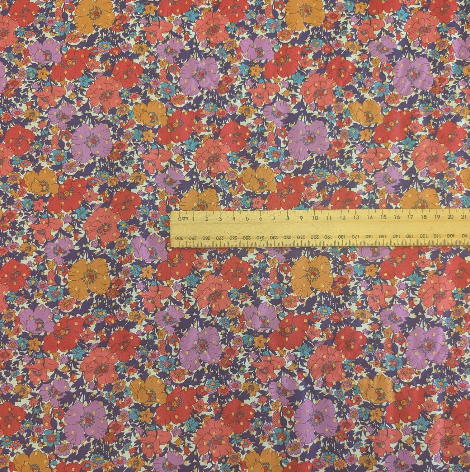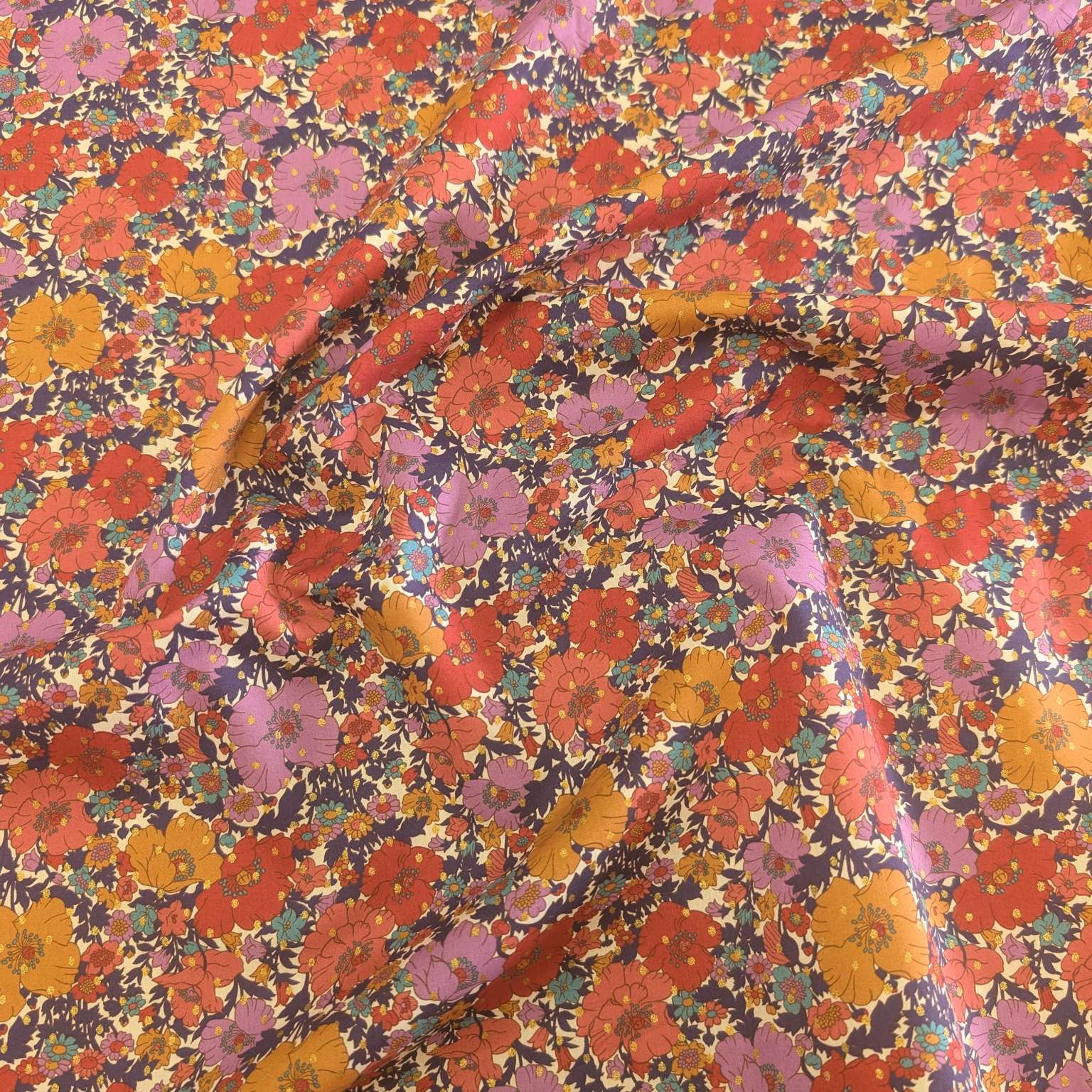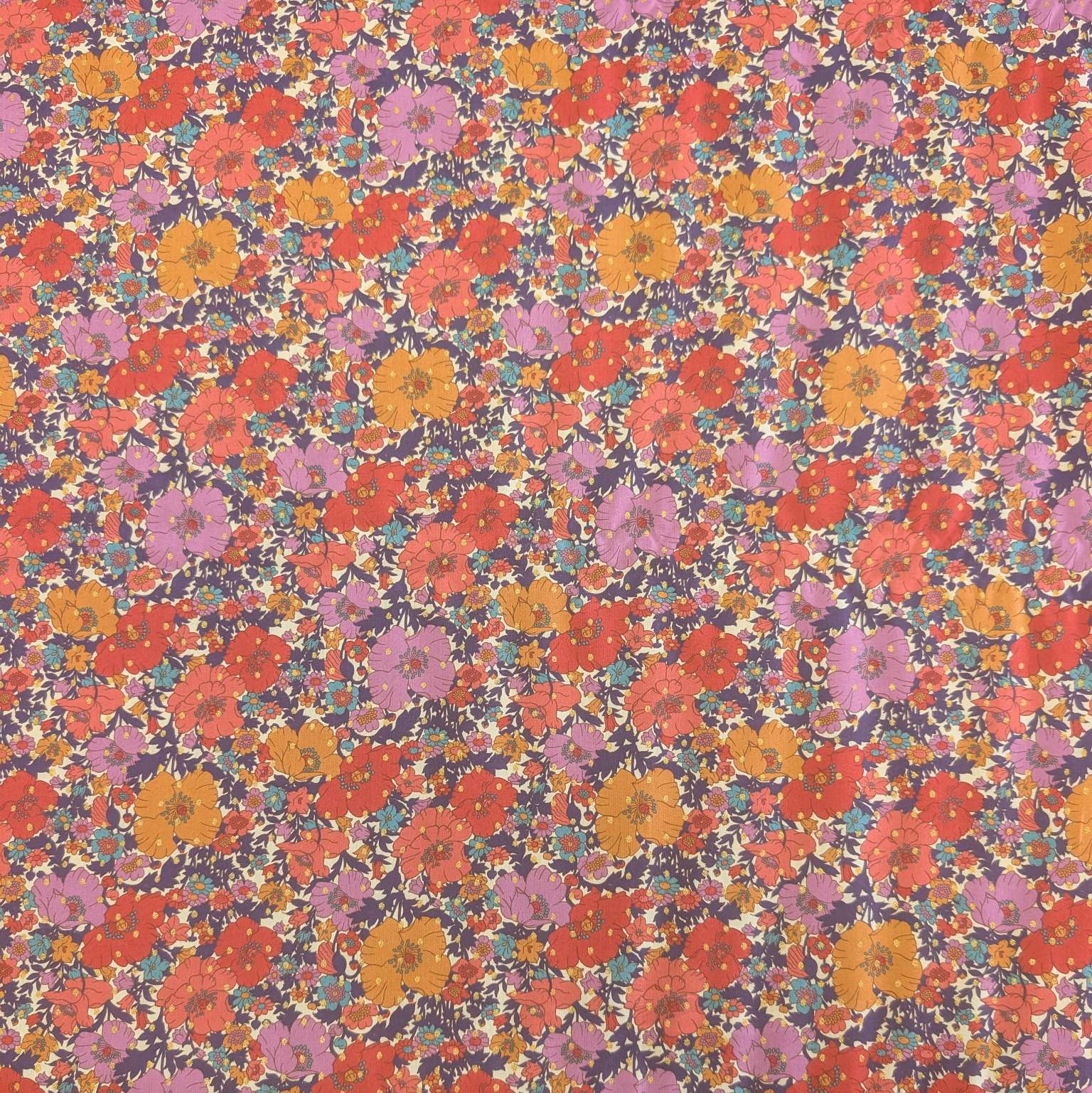 Lovely lightweight 100% cotton lawn in signature Liberty style. Meadow Song is a beautifully rendered botanical, redrawn from a hand-painted artwork discovered in the Liberty archive. Paying homage to Liberty’s long-standing love affair of poppies and daisies, it exhibits a nostalgic floral mood. Here it is enhanced with a jewel spot repeat for the Classic Metallic collection.