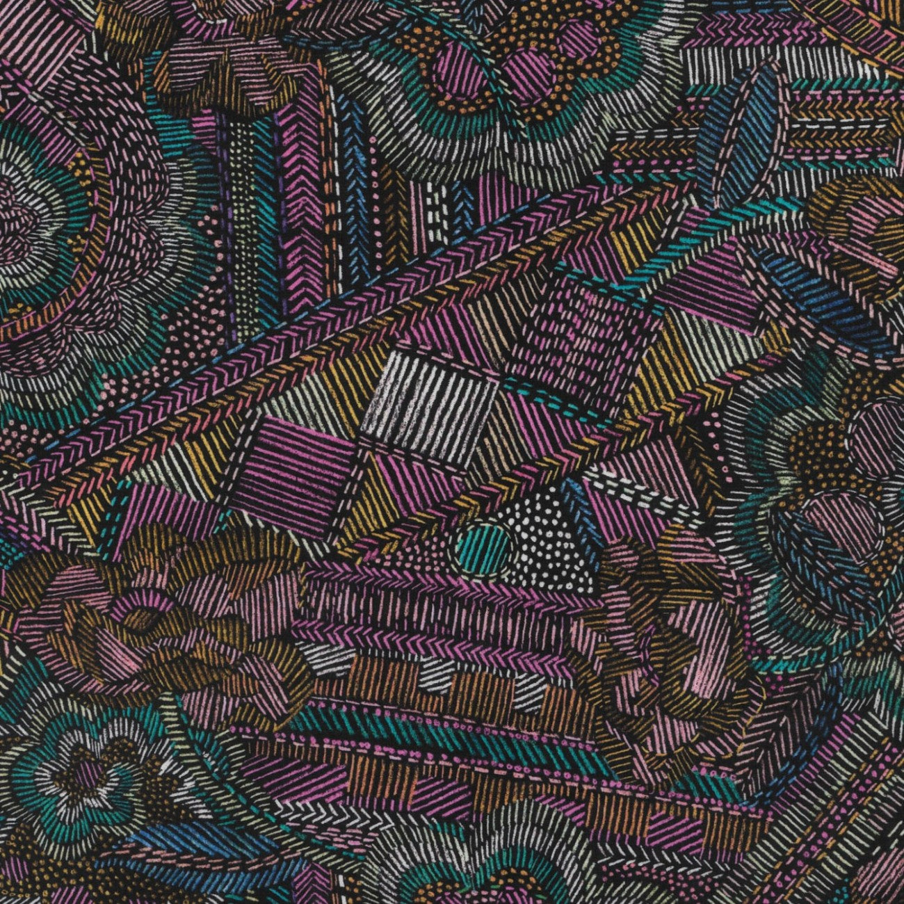 Created in the Liberty design studio using pencil crayon on dark coloured paper, Disco Fever explores the colourful embroideries used to embellish outfits worn during the 1970s disco nights. The result is a textural, hand-stitched effect, that showcases a captivating array of overlapping geometric and floral motifs.