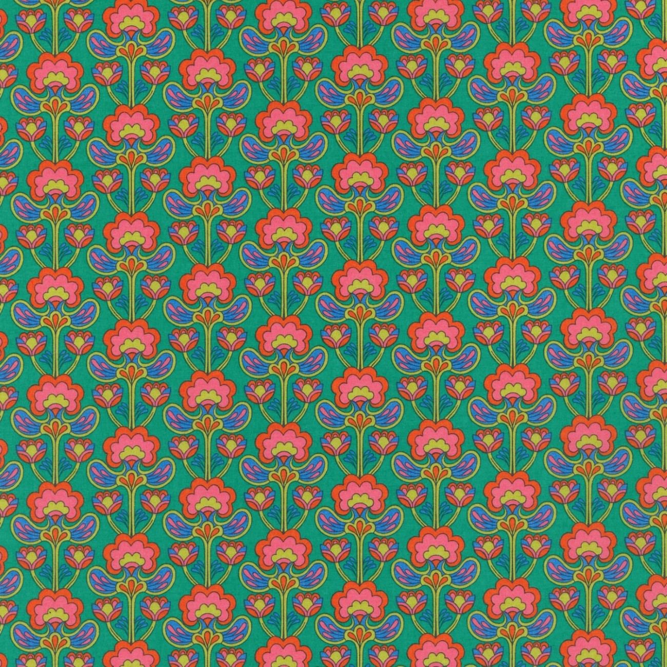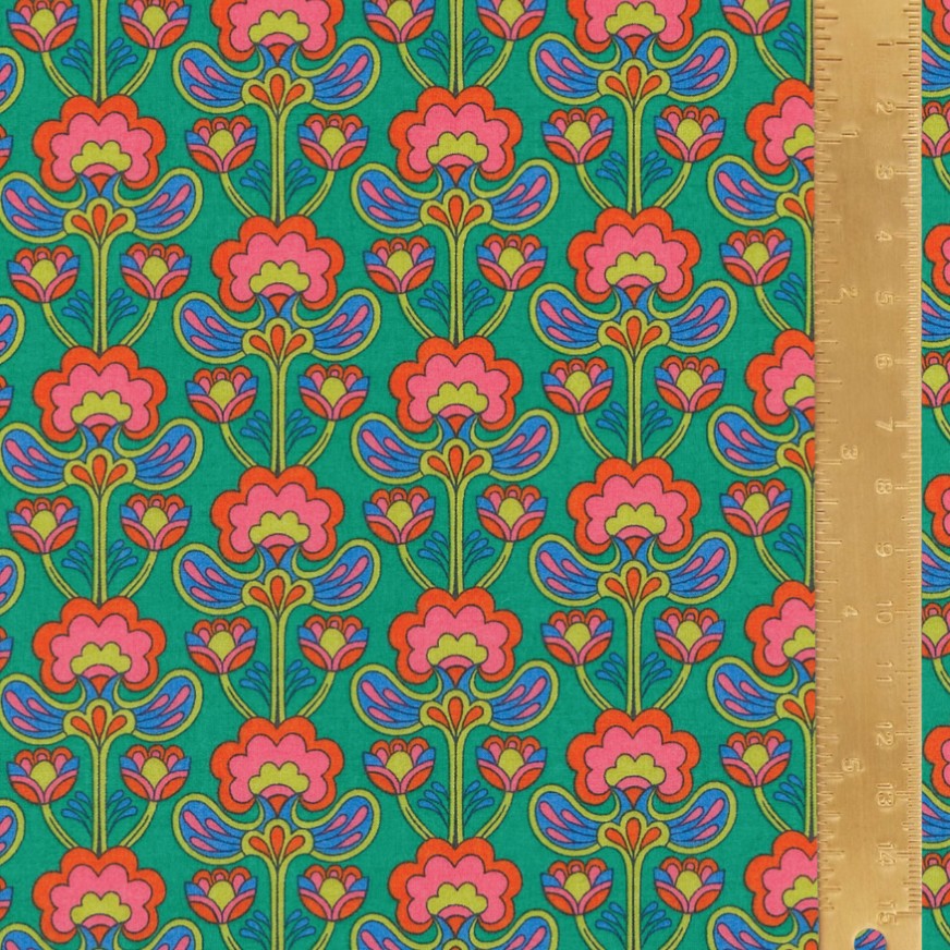 Evocative of the flamboyant fashion of the 1960s peacock revolution, this small-scale bohemian floral captures the era's departure from traditional tailoring towards a more expressive, experimental style. Originally designed by Liberty in 1965 during the Art Nouveau revival years, Peacock Posy showcases a vibrant floral motif arranged in a strikingly graphic, repeating pattern.