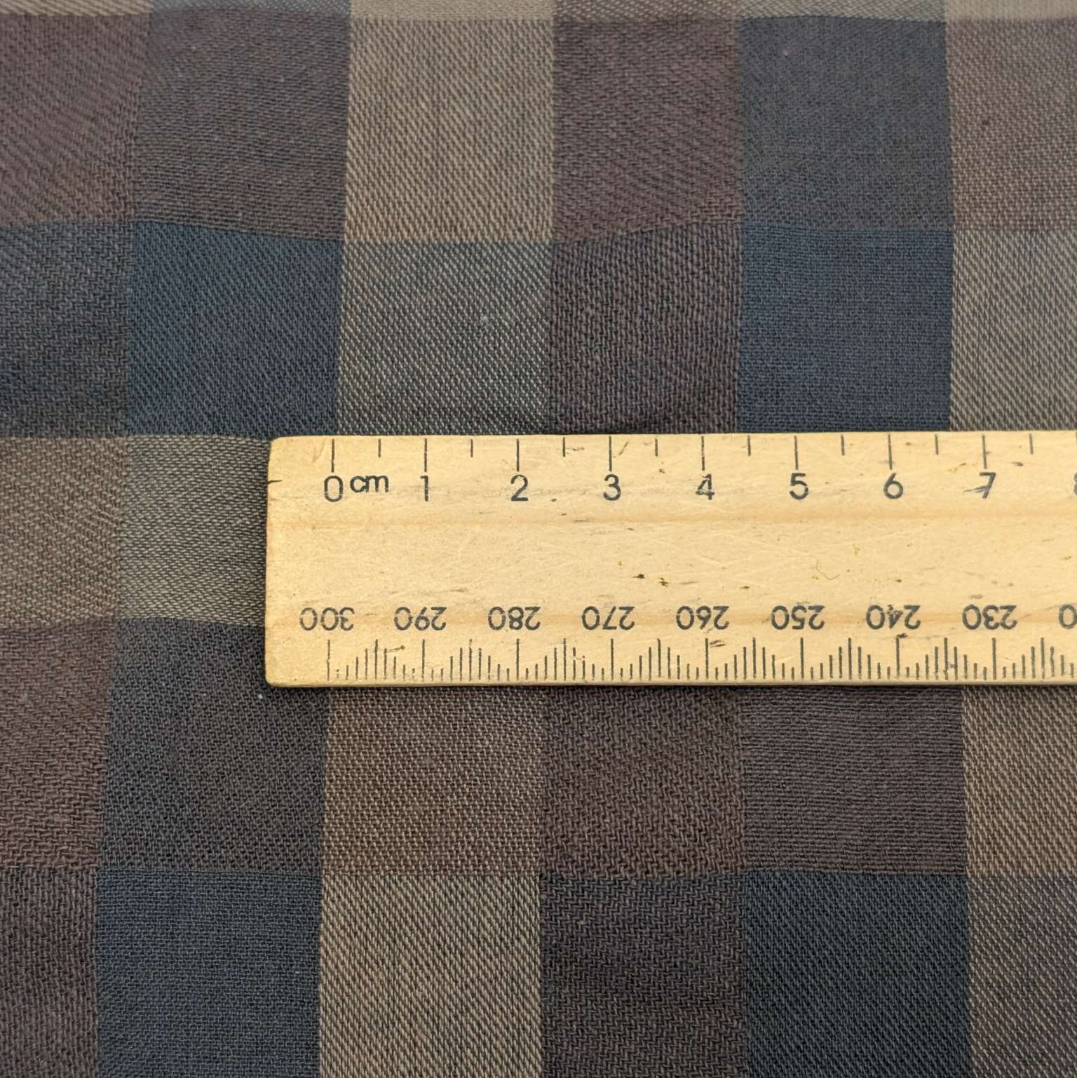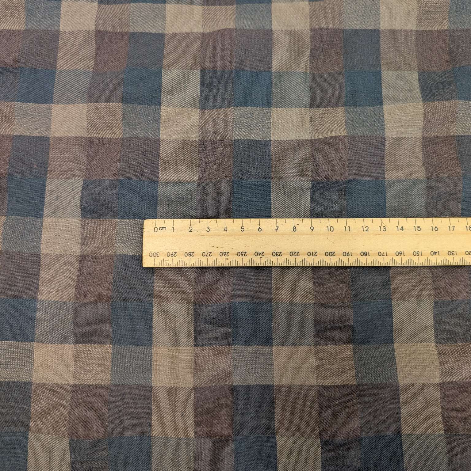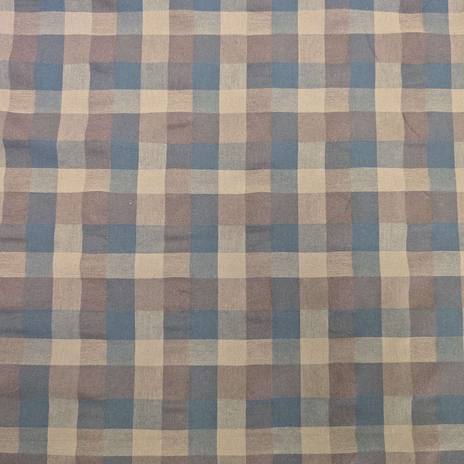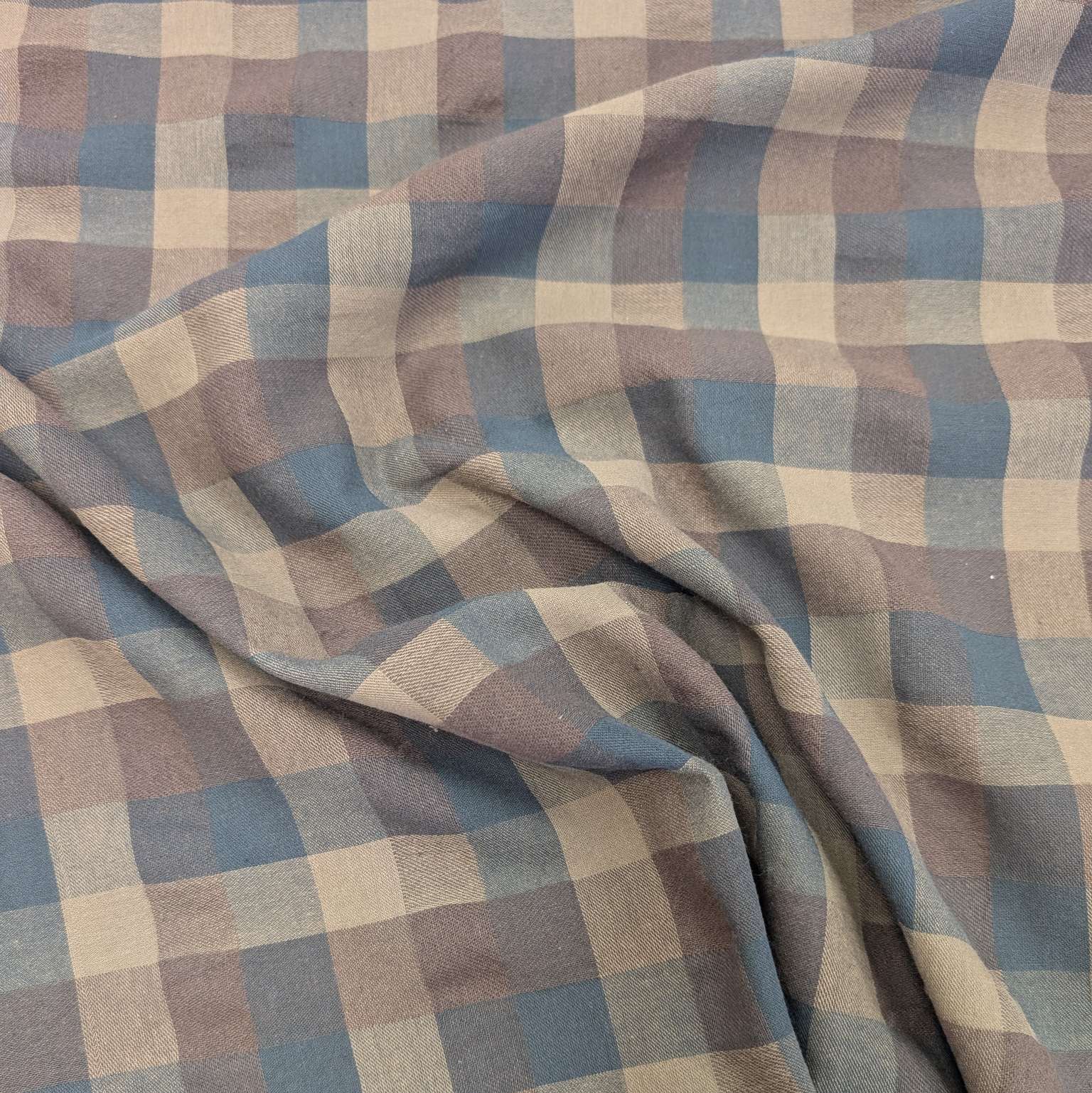 Beautiful soft yarn dyed 30% linen 70% cotton blend. Slightly irregular check in washed raisin, taupe and dusky blue. 22mm to 25mm check size. Cloth has very slight pucker.