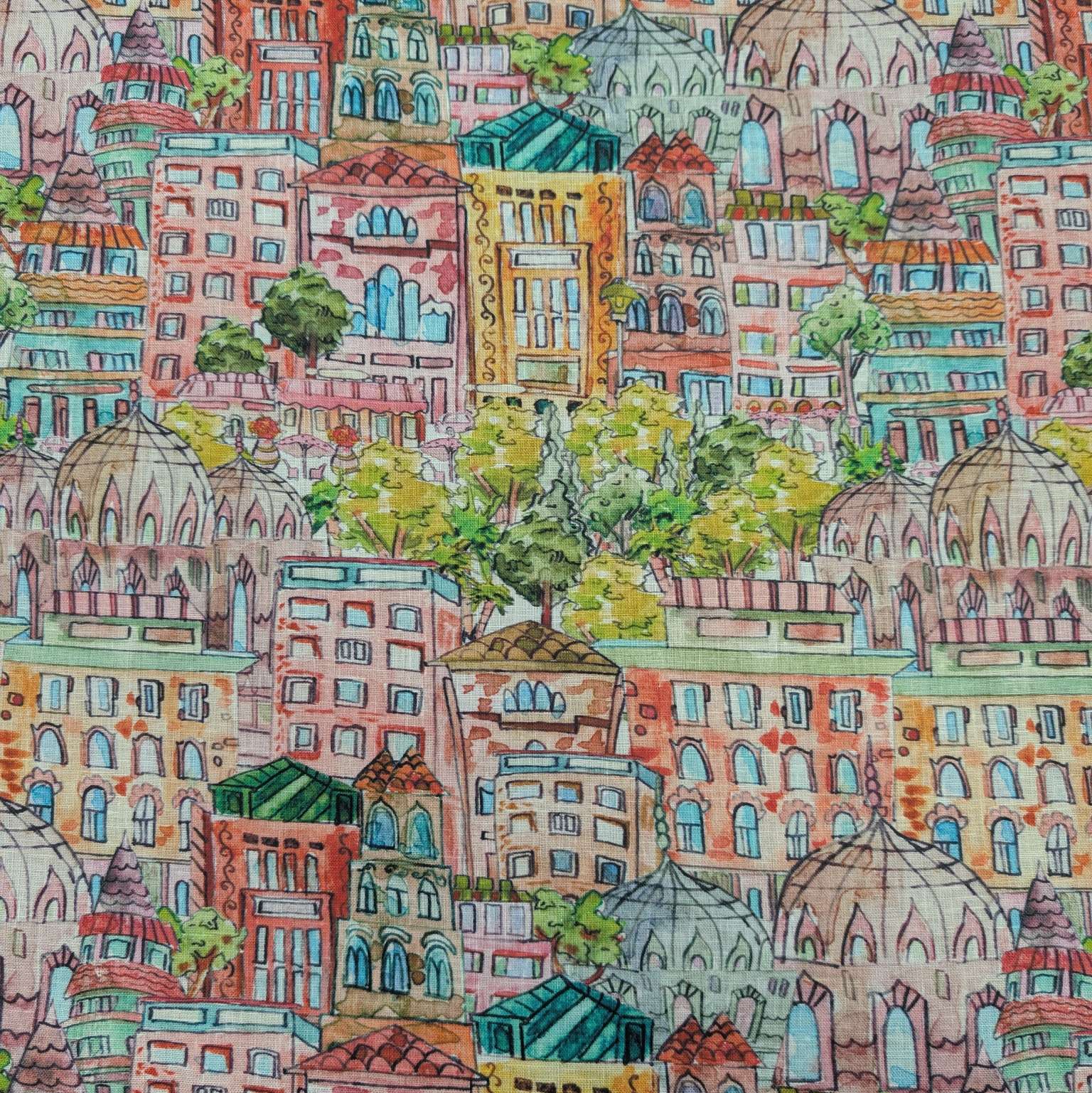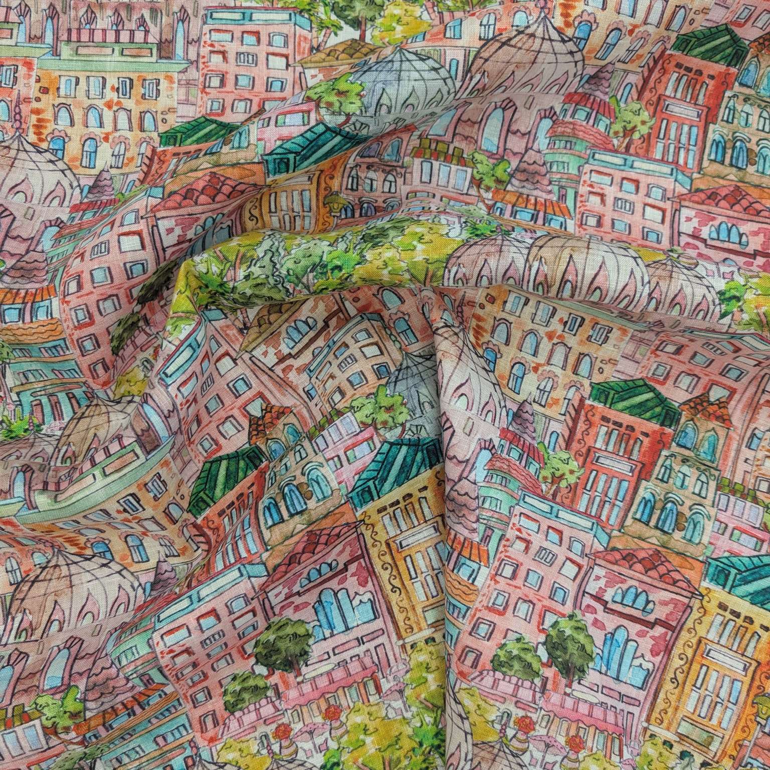 Medium weight 100% washed linen with all over European cityscape. Warm colour way of pinks, peach, red and Browns with pips of blues and greens.
