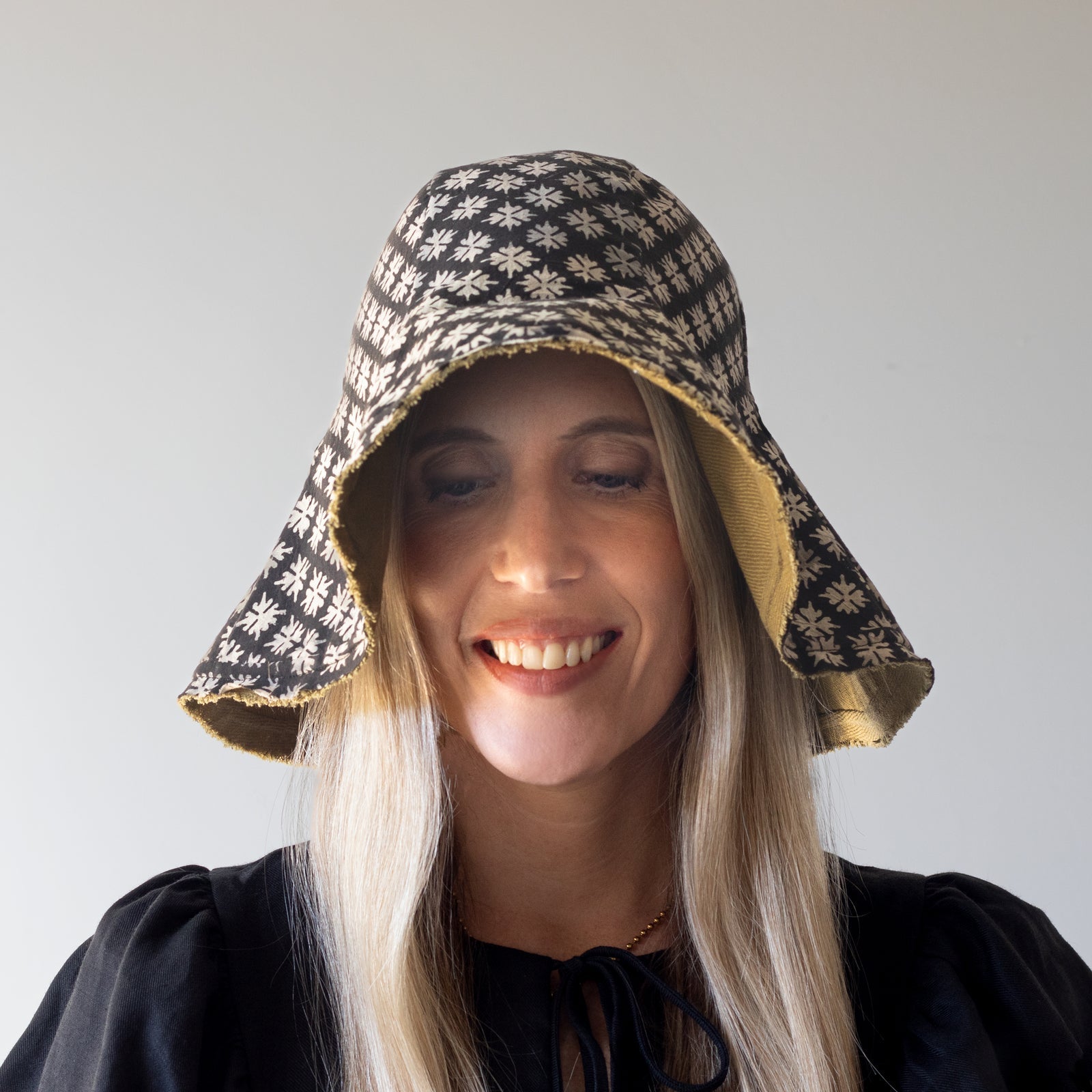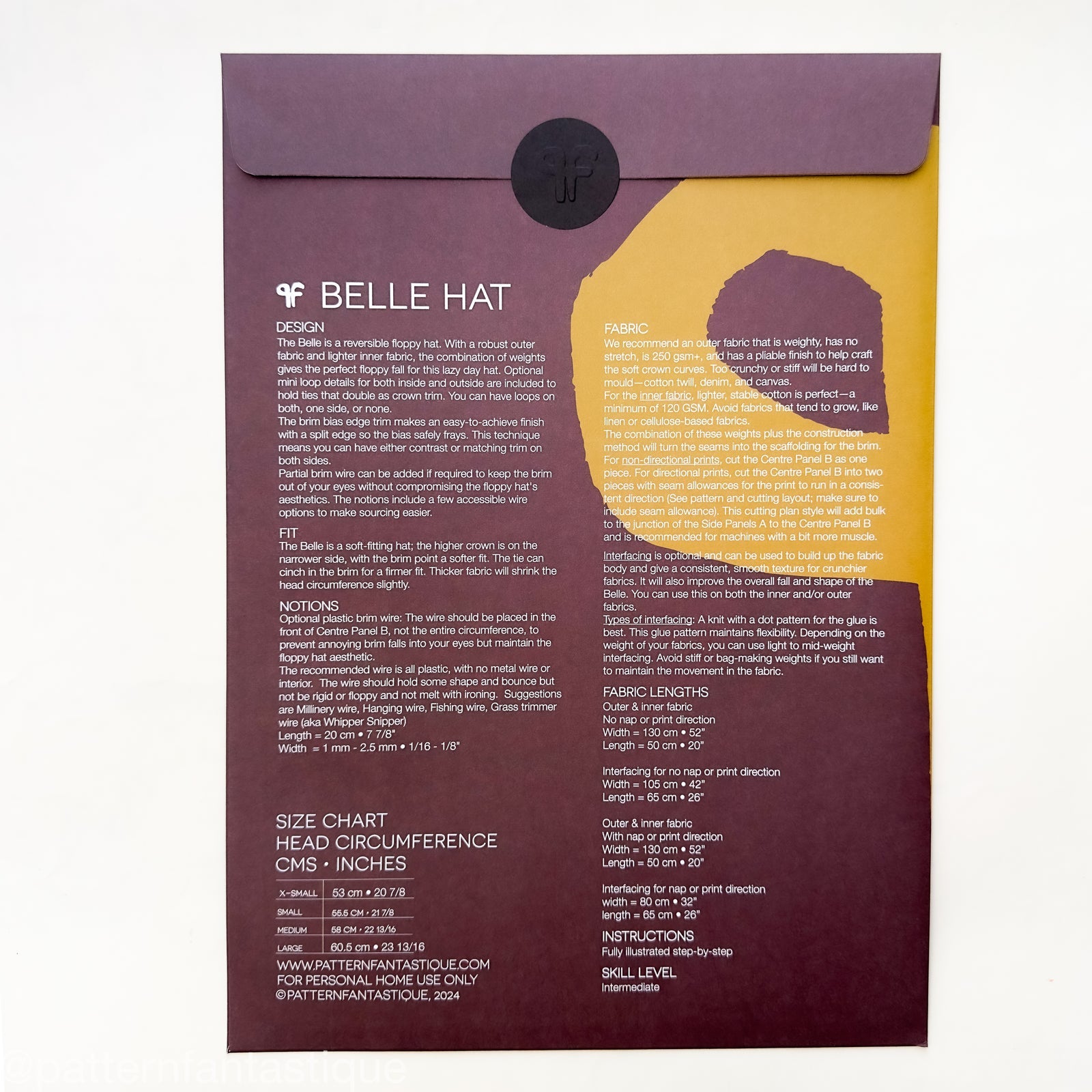 The Belle is a reversible floppy hat. With a robust outer fabric and lighter inner fabric, the combination of weights gives the perfect floppy fall for this lazy day hat. Optional mini loop details for both inside and outside are included to hold ties that double as crown trim. You can have loops on both, one side, or none. The brim bias edge trim makes an easy-to-achieve finish with a split edge so the bias safely frays. This technique means you can have either contrast or matching trim on both sides. Partial brim wire can be added if required to keep the brim out of your eyes without compromising the floppy hat's aesthetics. The notions include a few accessible wire options to make sourcing easier.