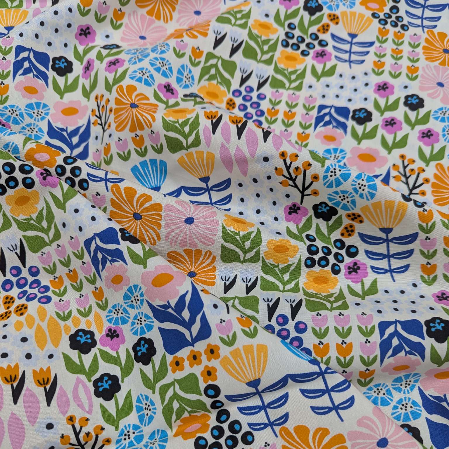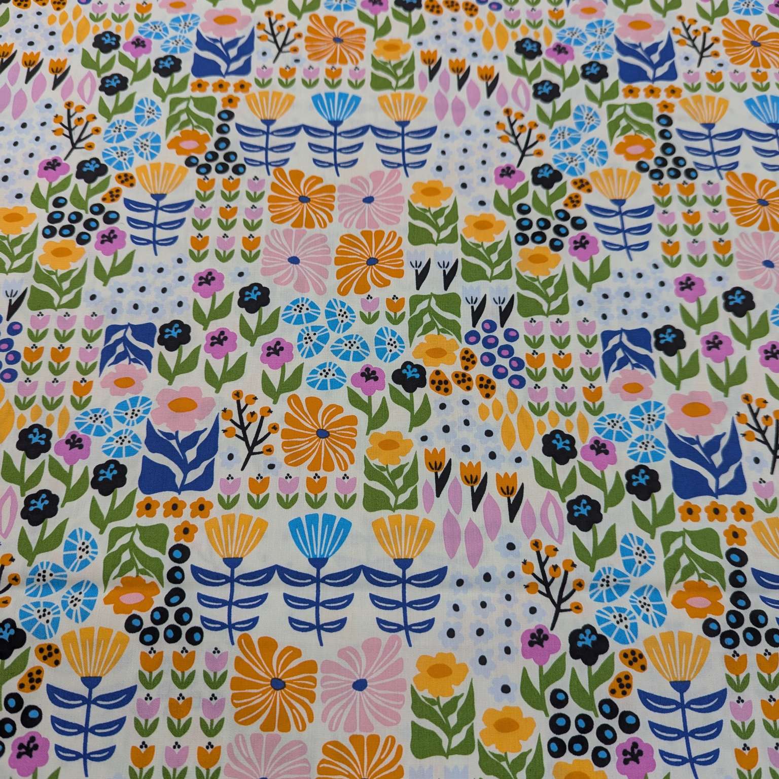 Art Gallery premium mid weight cotton with beautiful drape . Cream background with orange, pink and blue abstract floral design in check layout. Oeko Tex certified.