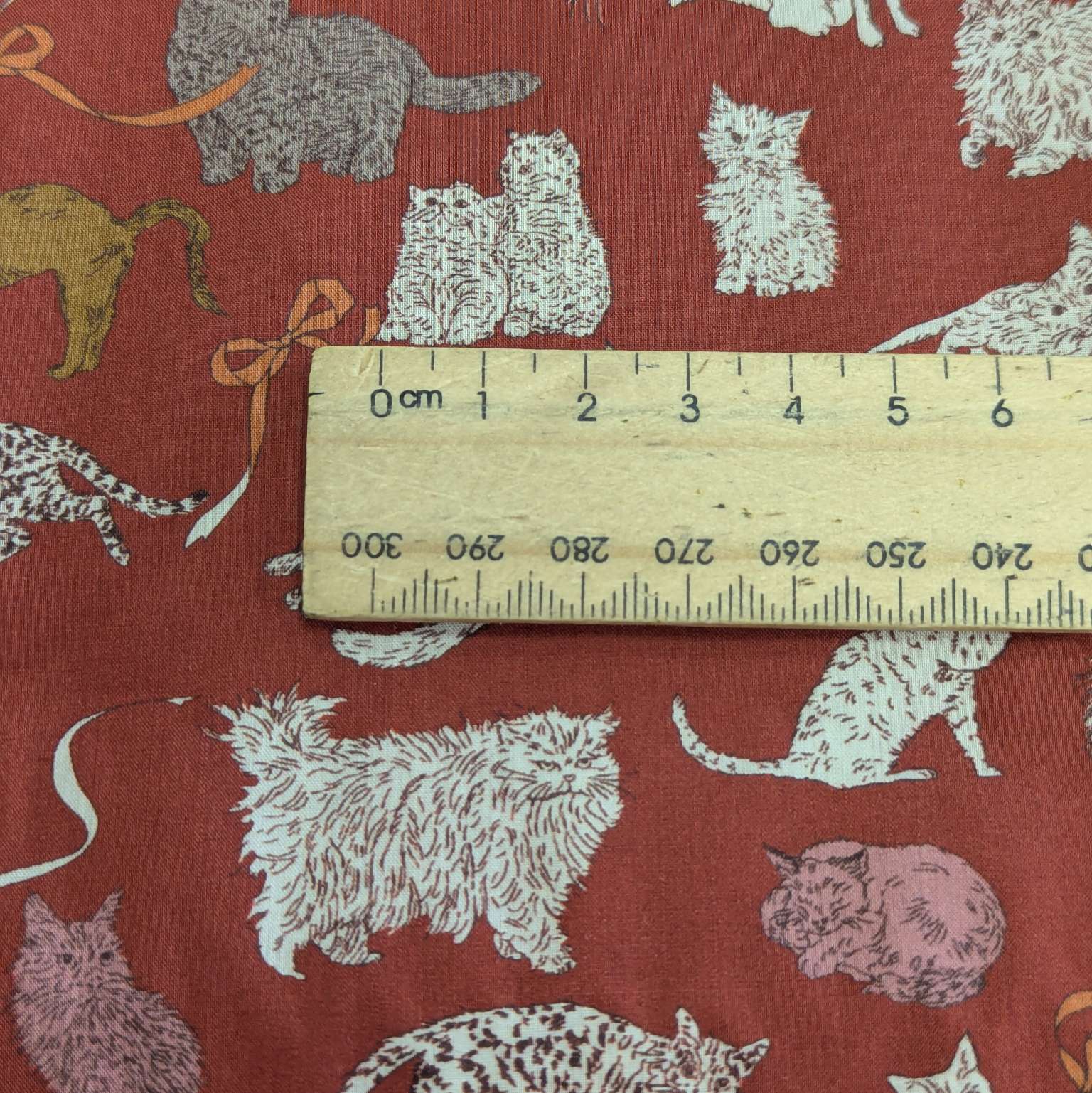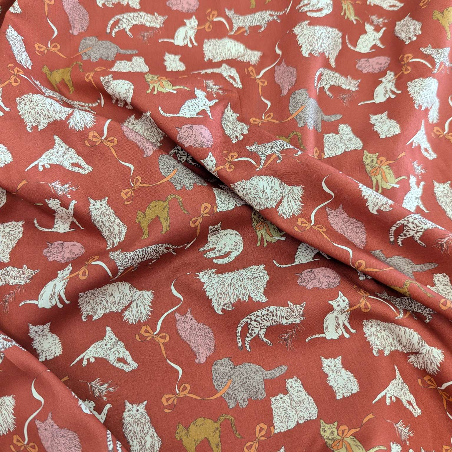 Decades in Bloom celebrates Liberty's iconic scarf legacy, a treasure trove of creativity spanning over 150 years. Drawing from the vast expanse of Liberty's world-famous archive, this collection pays homage to the enduring elegance of Liberty scarf designs - creations that have transcended the boundaries of fashion to become timeless symbols of style and refinement. Koh and Eito is a whimsical design of playful cats entwined with a ribbon garland. Colour B is a red rusty base.
