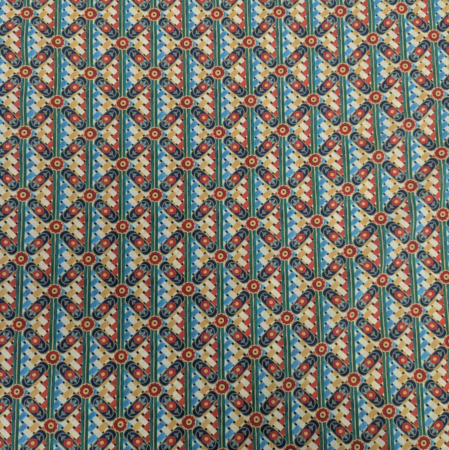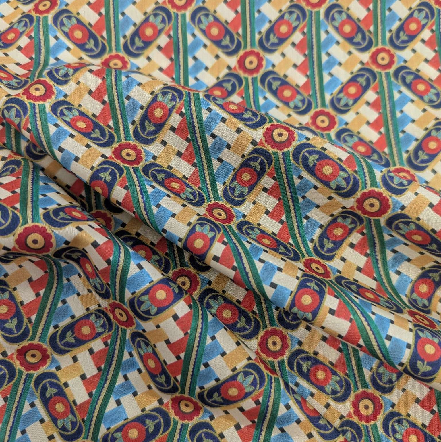 Decades in Bloom celebrates Liberty's iconic scarf legacy, a treasure trove of creativity spanning over 150 years. Drawing from the vast expanse of Liberty's world-famous archive, this collection pays homage to the enduring elegance of Liberty scarf designs - creations that have transcended the boundaries of fashion to become timeless symbols of style and refinement. Noko Weave is a basketweave design with floral elements. Colourway B has cream, blue and red colours with green and black accents