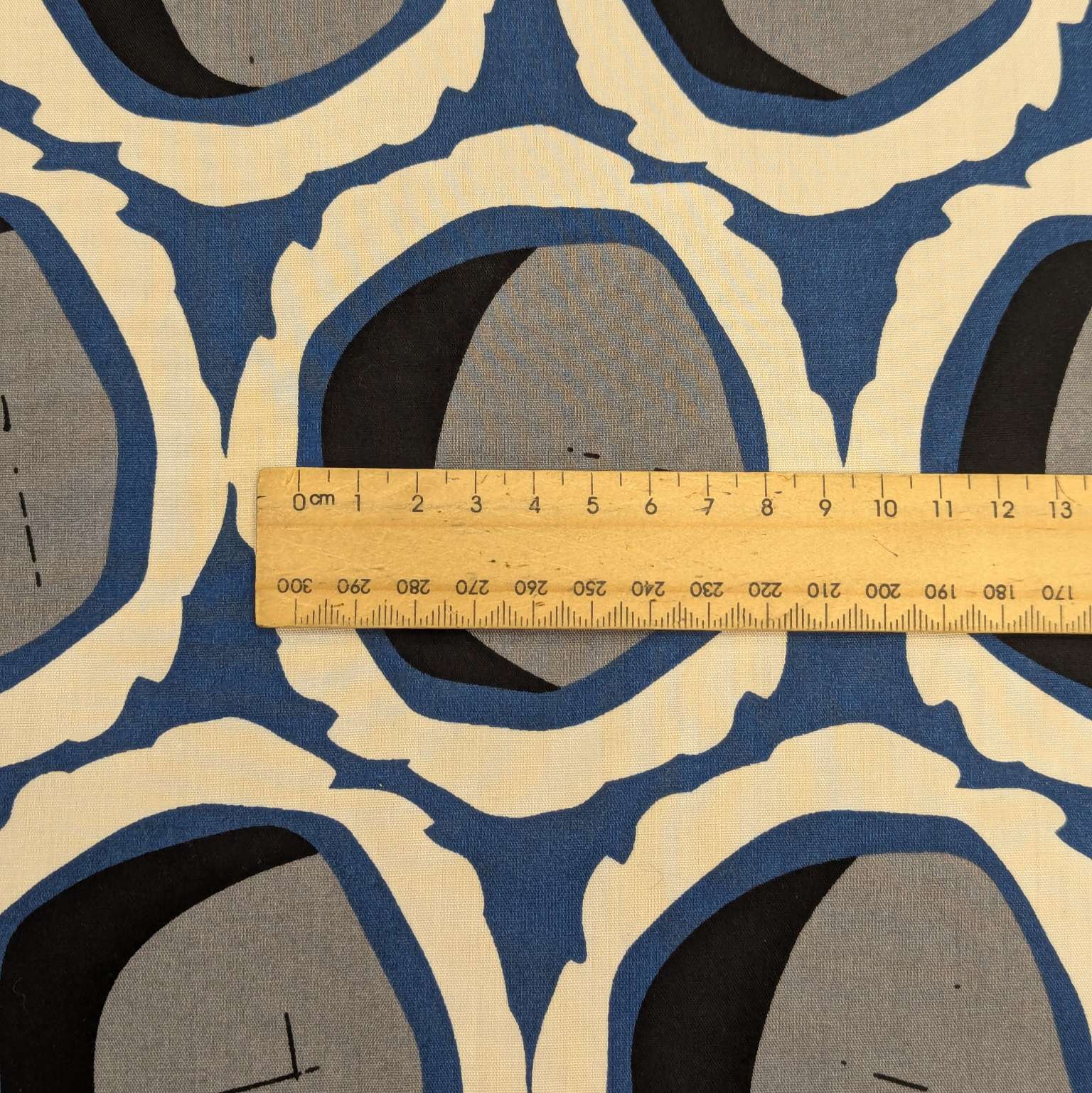 Lovely soft rayon with abstract geometric circular design. Light cream base with grey circular design with blue and black accents
