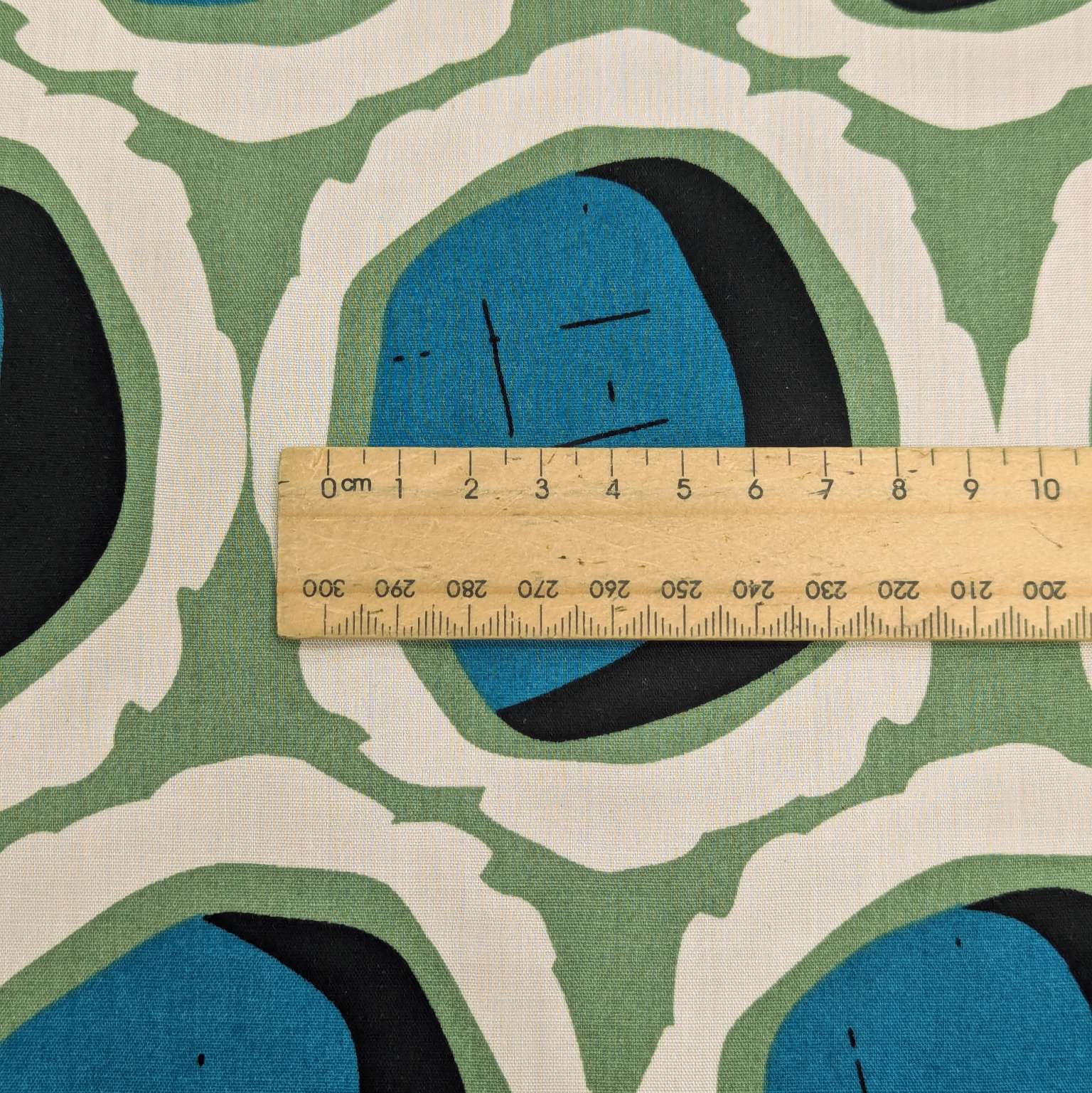 Lovely soft rayon with abstract geometric circular design. Light cream base with teal circular design with green and black accents